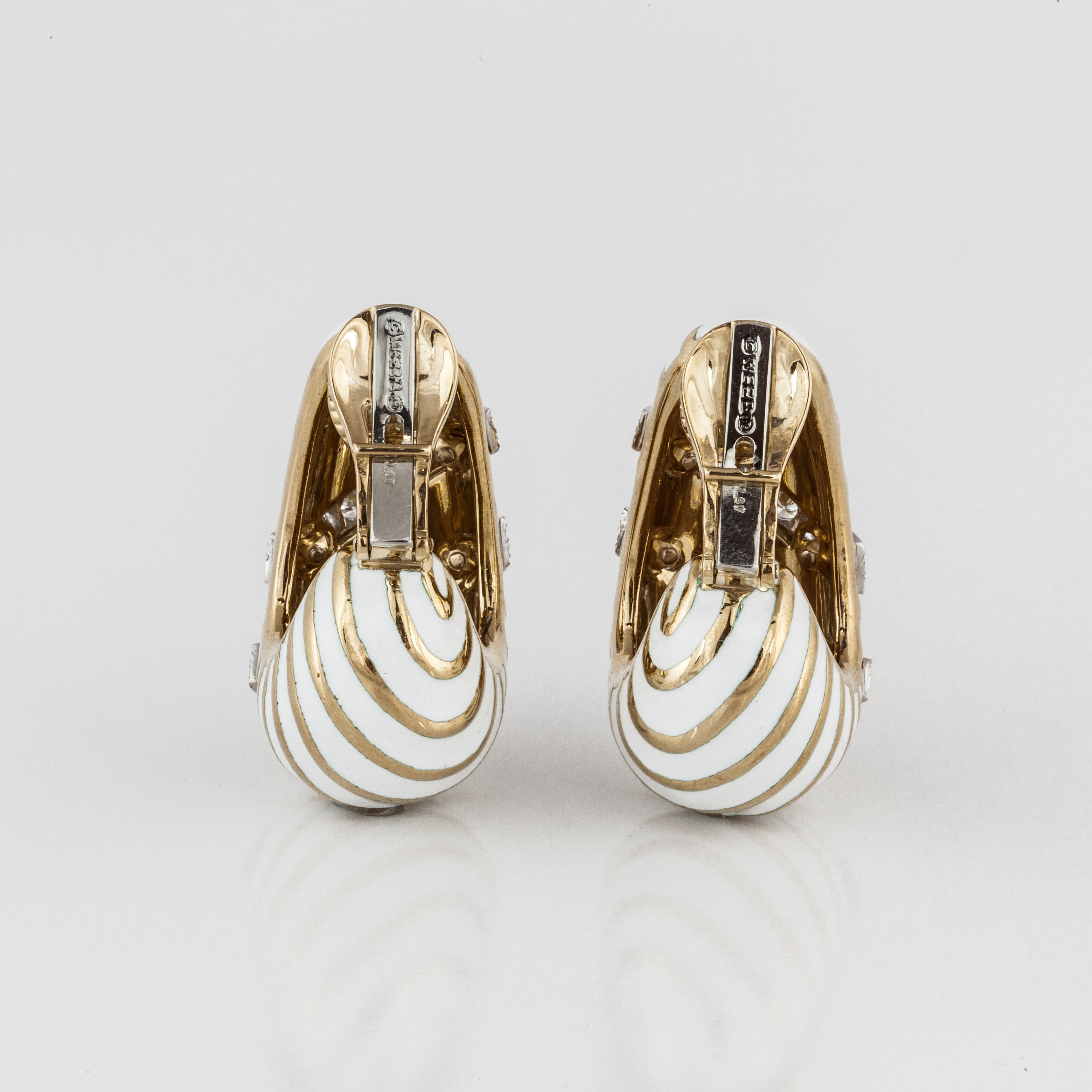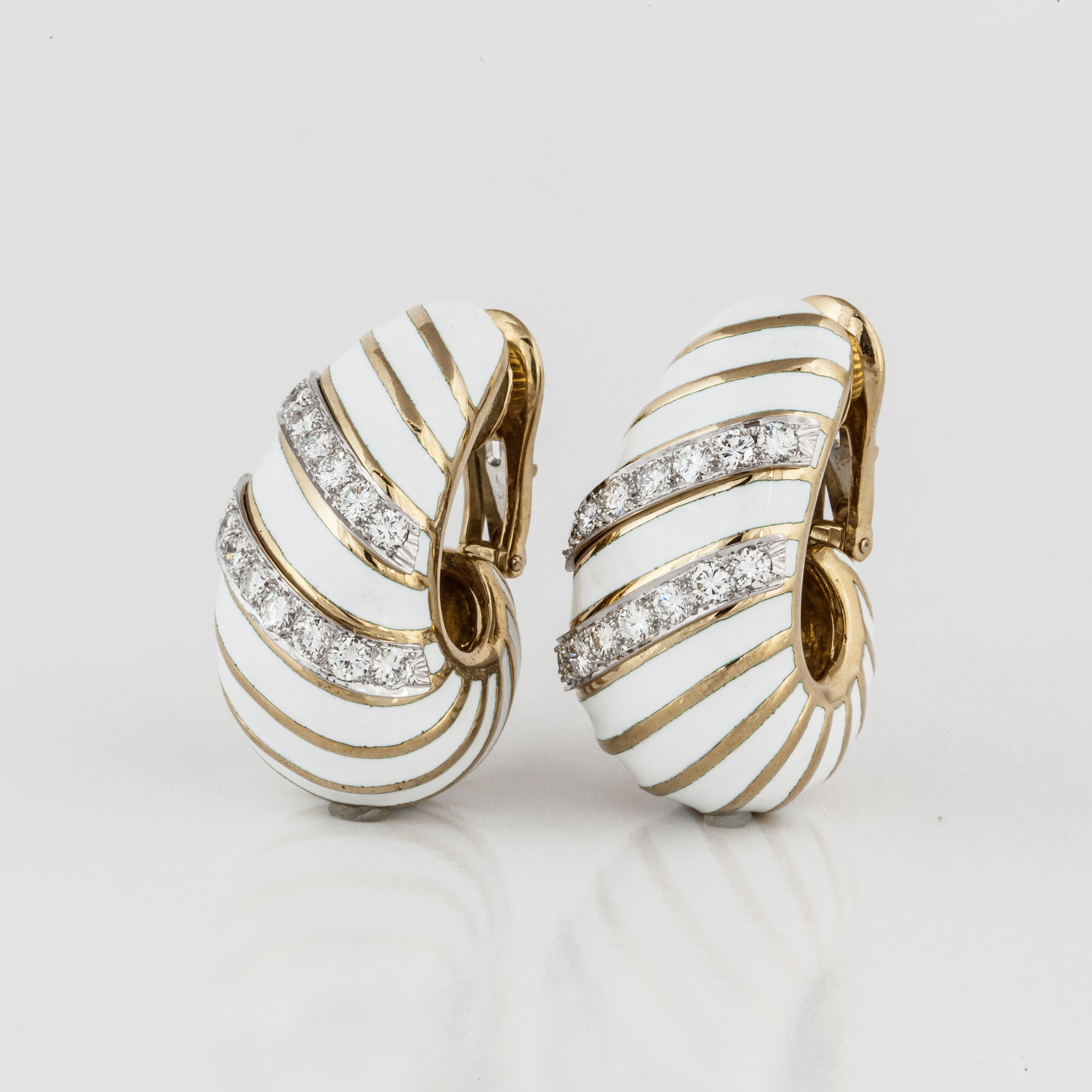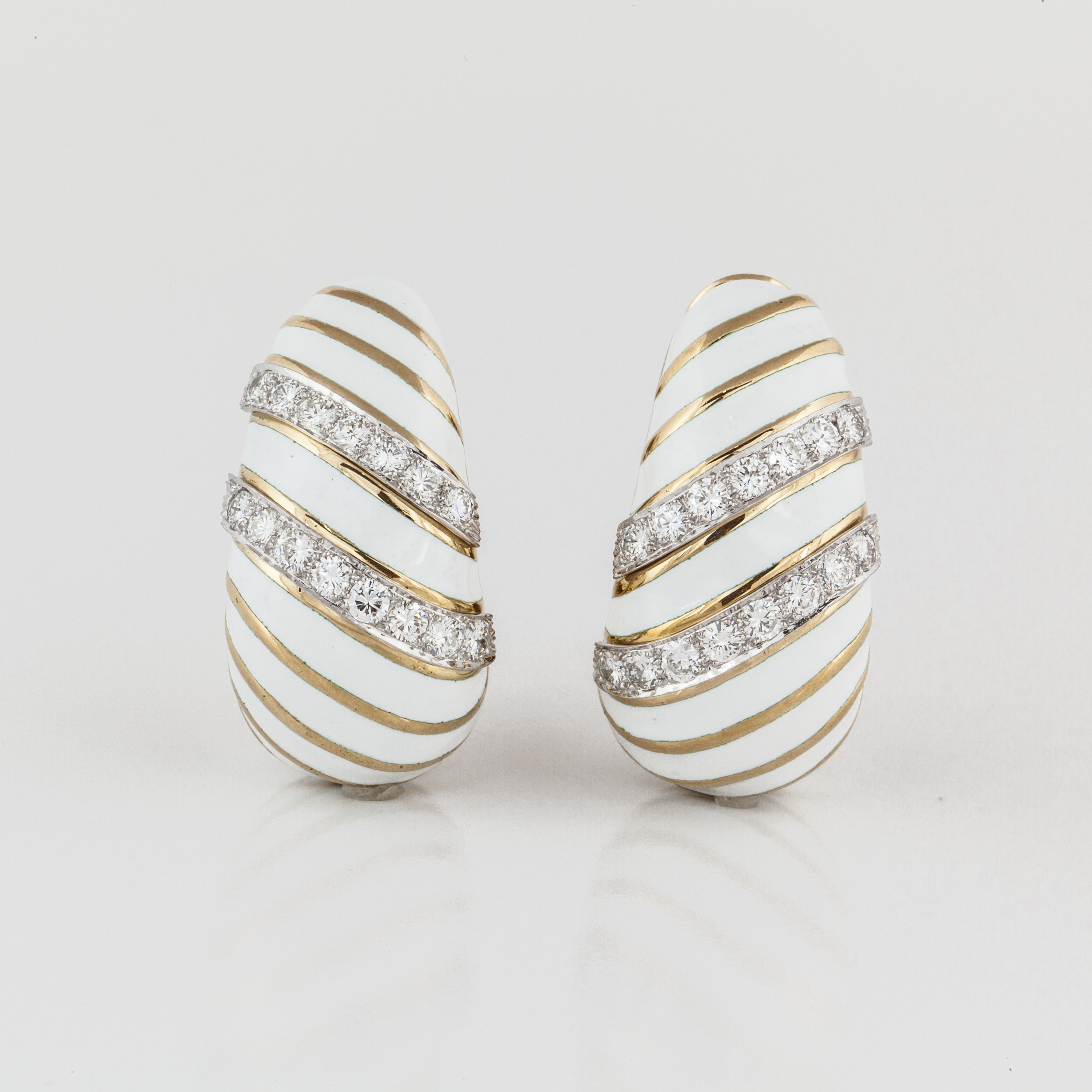 A pair of estate David Webb 18K yellow gold white enamel and diamond earrings stripe earrings, from the Manhattan Minimalism Collection. Vintage & Estate CollectionDiamonds: 2.40 caratsG-H/VVS2-VS1