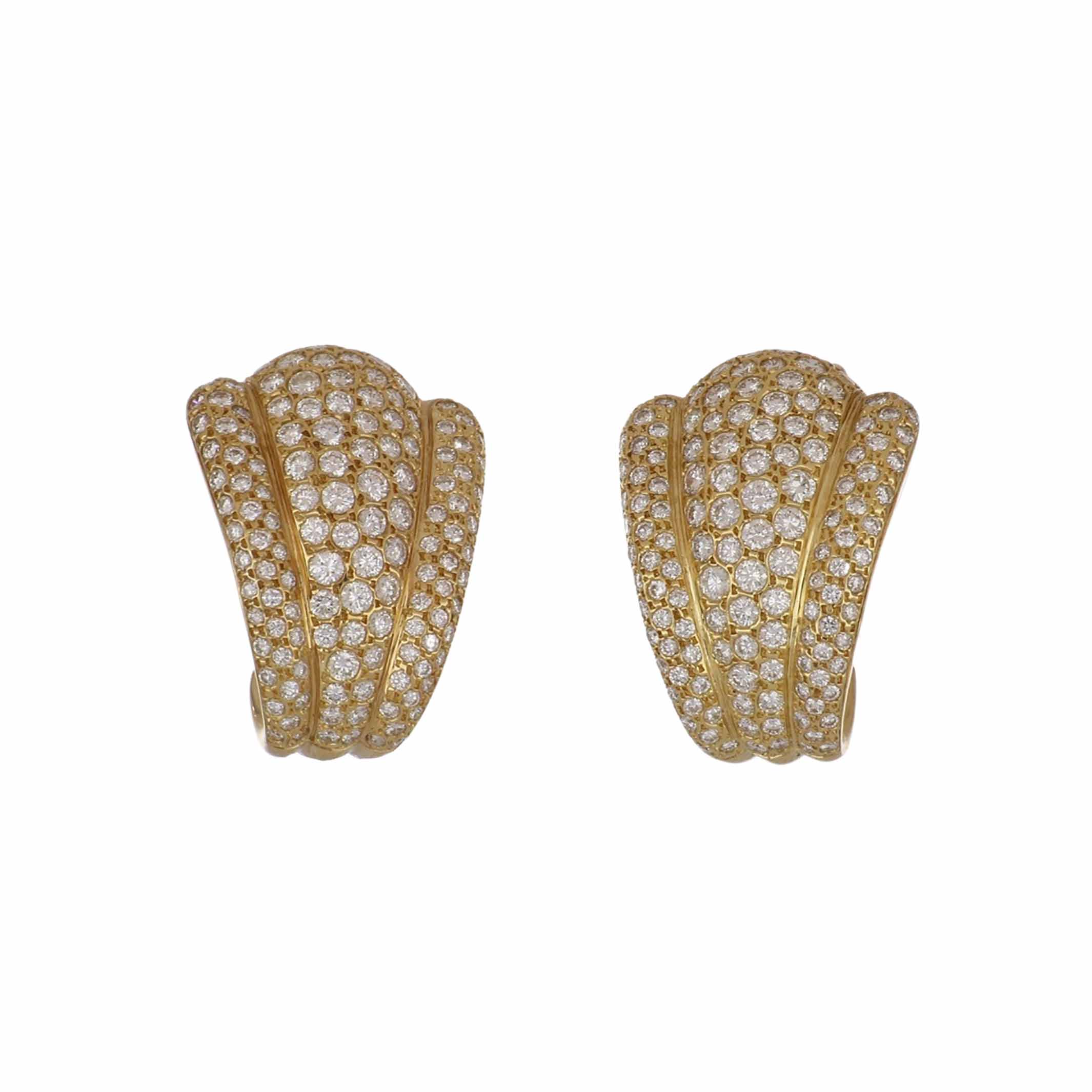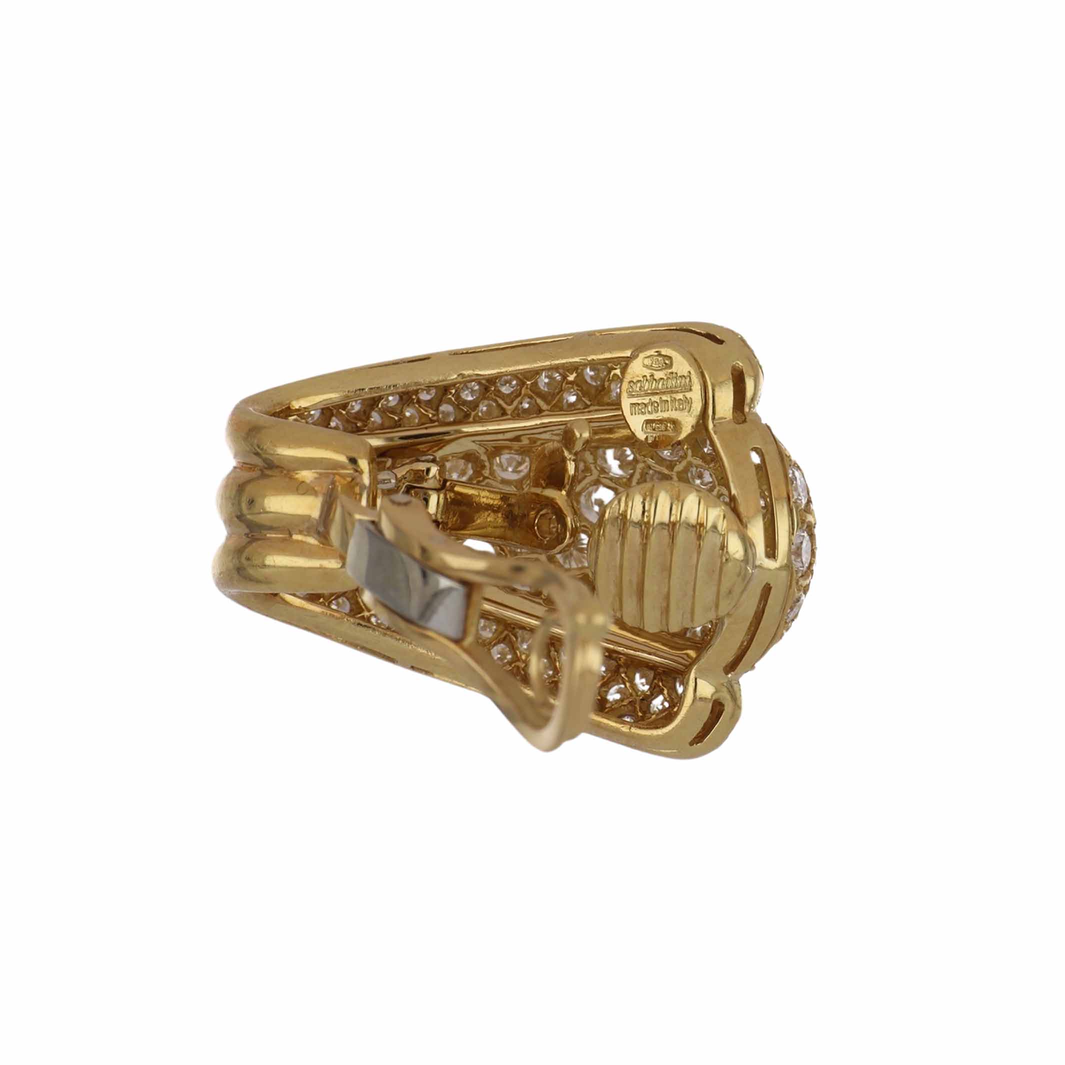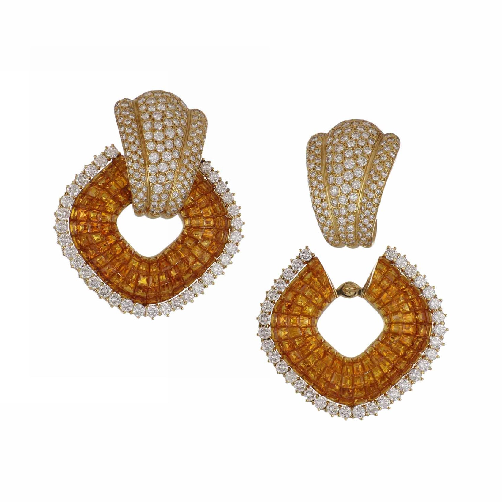 A pair of estate Sabbadini invisible-set yellow sapphire and diamond doorknocker day/night 18K yellow gold earrings. Italy; circa 2010.