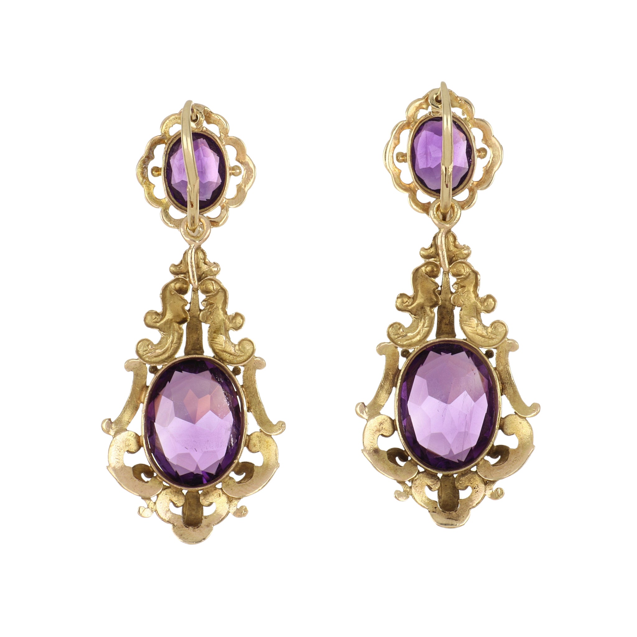 A pair of antique Georgian, repoussé day/night oval shape amethyst earrings with back hooks set in 14K yellow gold. Circa 1830.