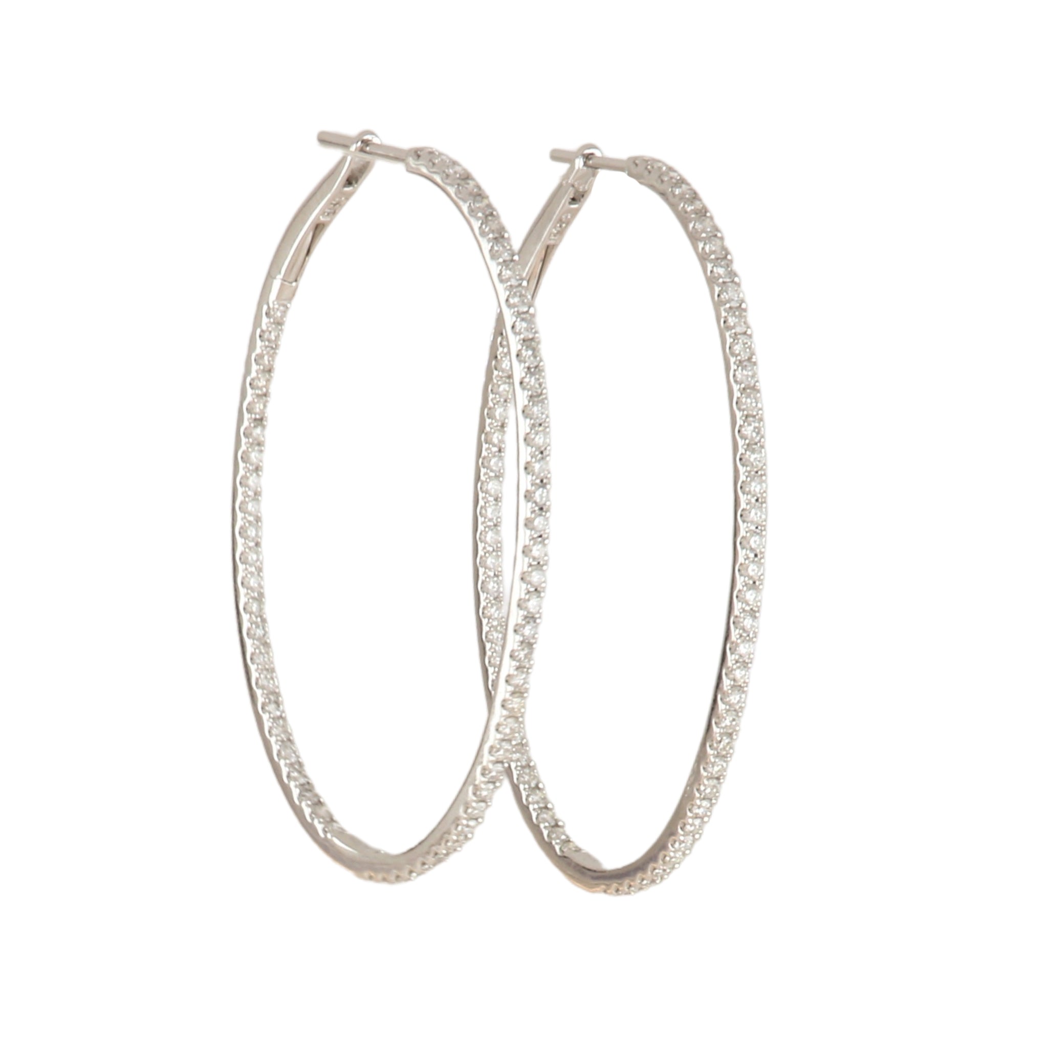 A pair of elongated oval shape, prong-set round brilliant-cut diamond hoop earrings, set in 18k white gold.