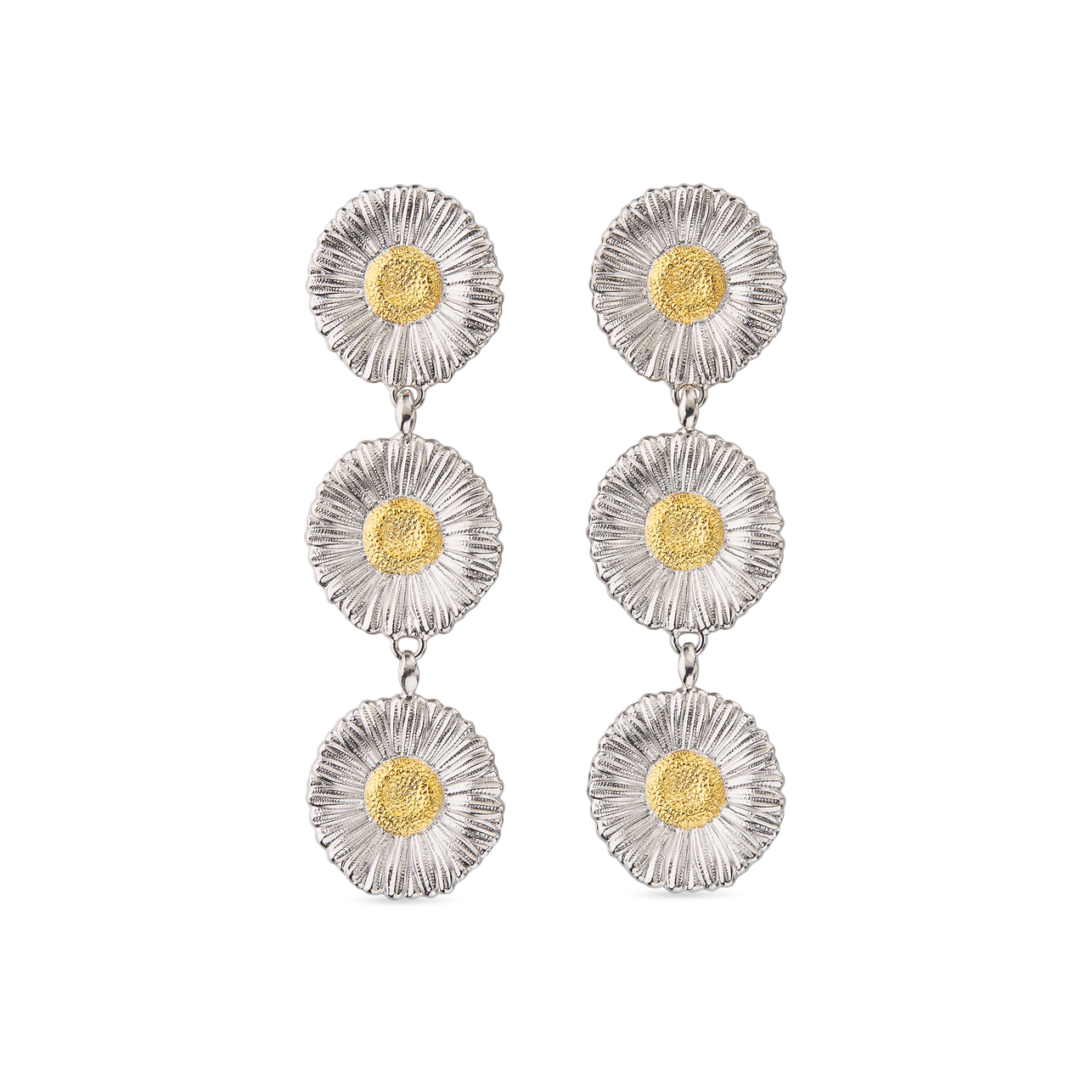 A pair of Buccellati sterling silver with yellow gold accents Daisy Blossom Collection triple drop pendant earrings. Official Retailer3.5 inches in length