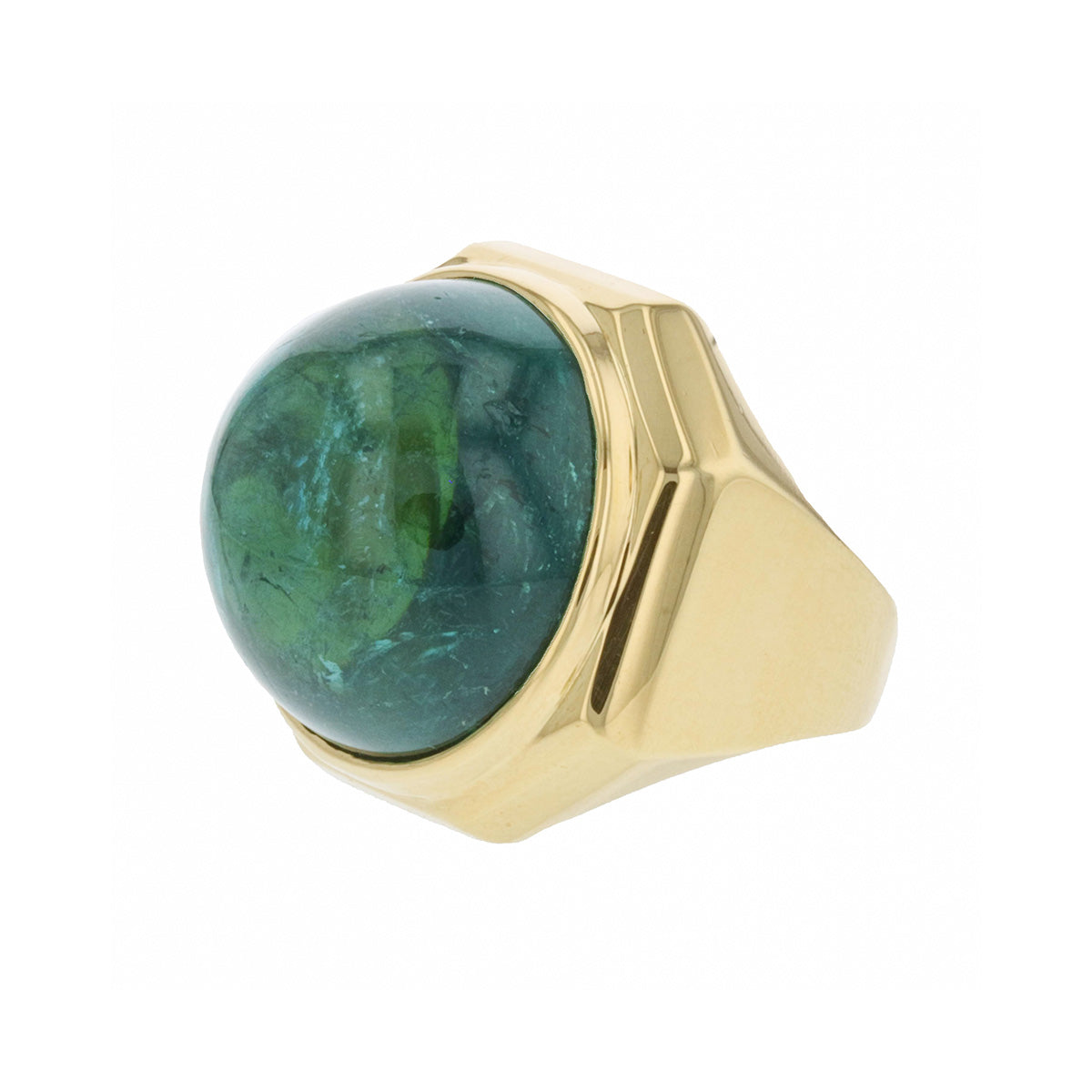 An estate cabochon green tourmaline ring, in a hexagonal 18K yellow gold mounting.Vintage & Estate CollectionTourmaline=41 caratsSize= 6.50