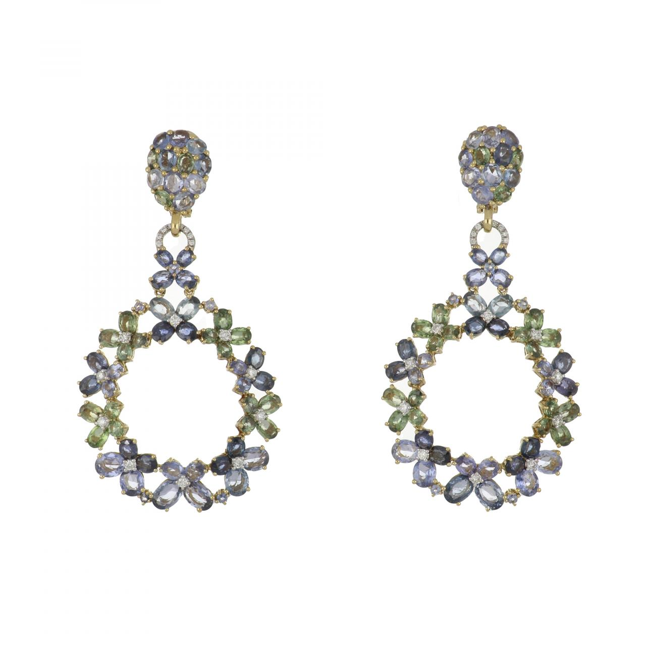 A pair of estate green and blue sapphire and diamond, openwork circular trellis drop earrings with collapsible posts in 18K yellow gold. Circa 2010