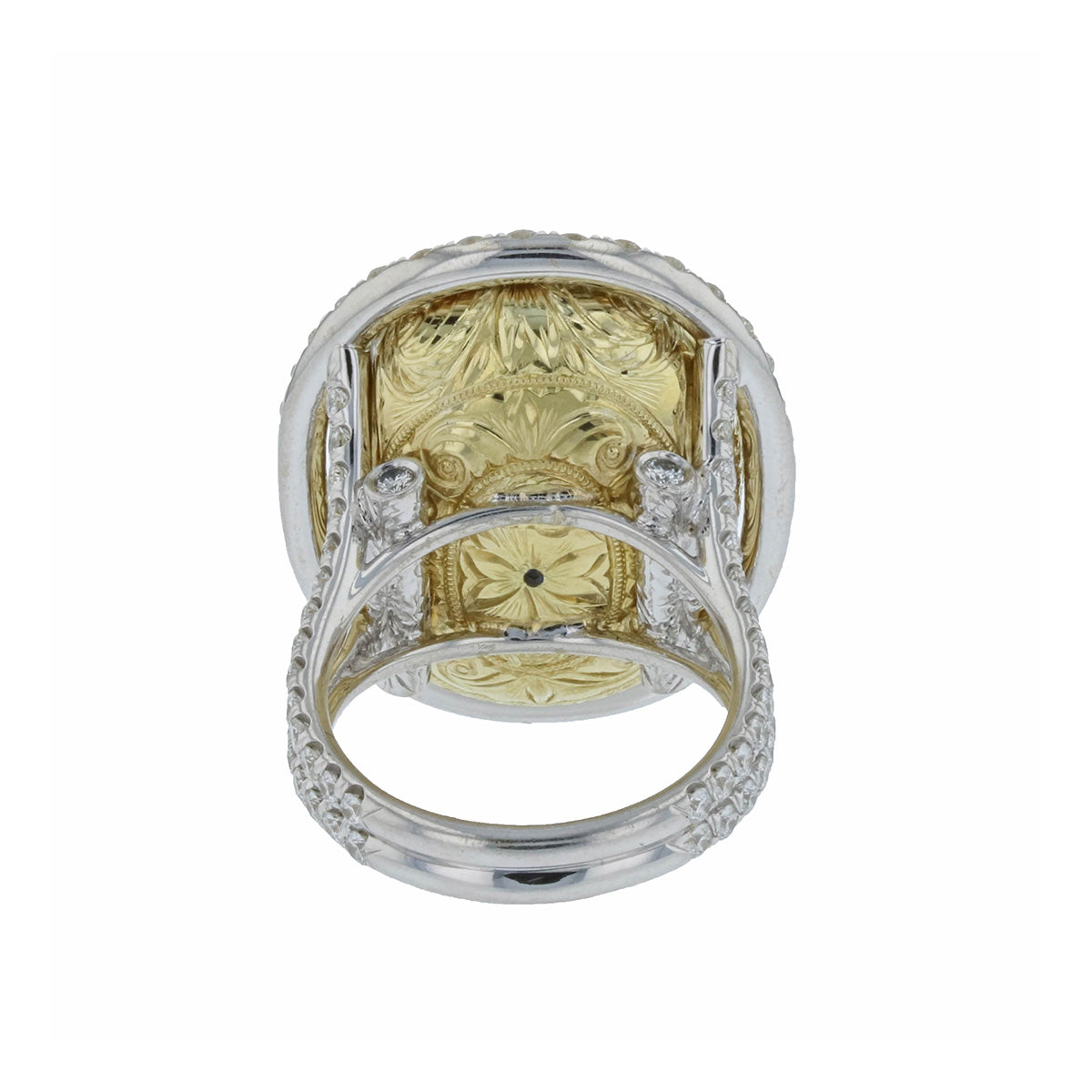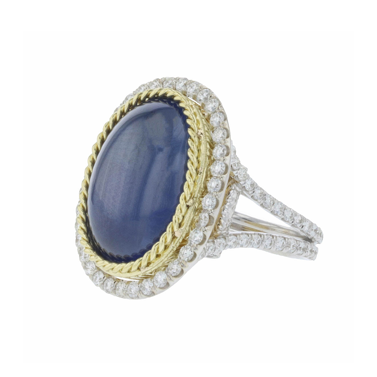 An estate cabochon no heat Ceylon star sapphire ring with round diamond frame, in 18K white and yellow gold.