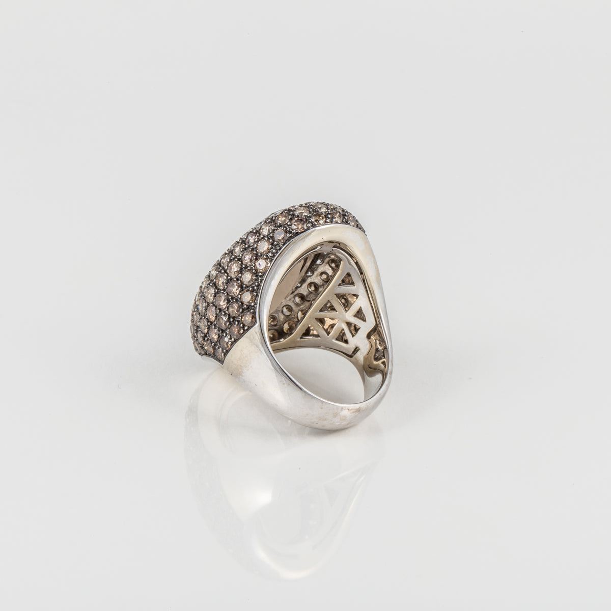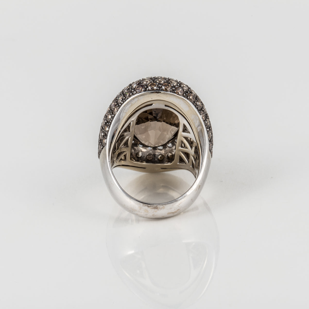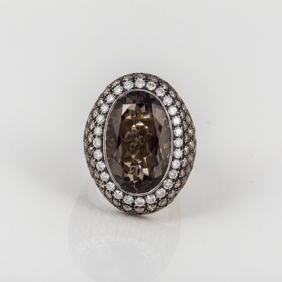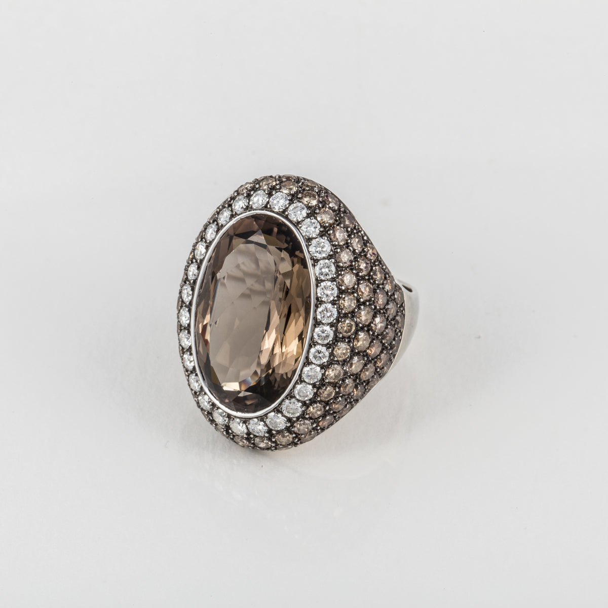 An estate oval smoky quartz ring with brown & white diamonds, set in 18K white gold. Circa 2010.