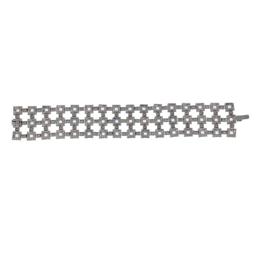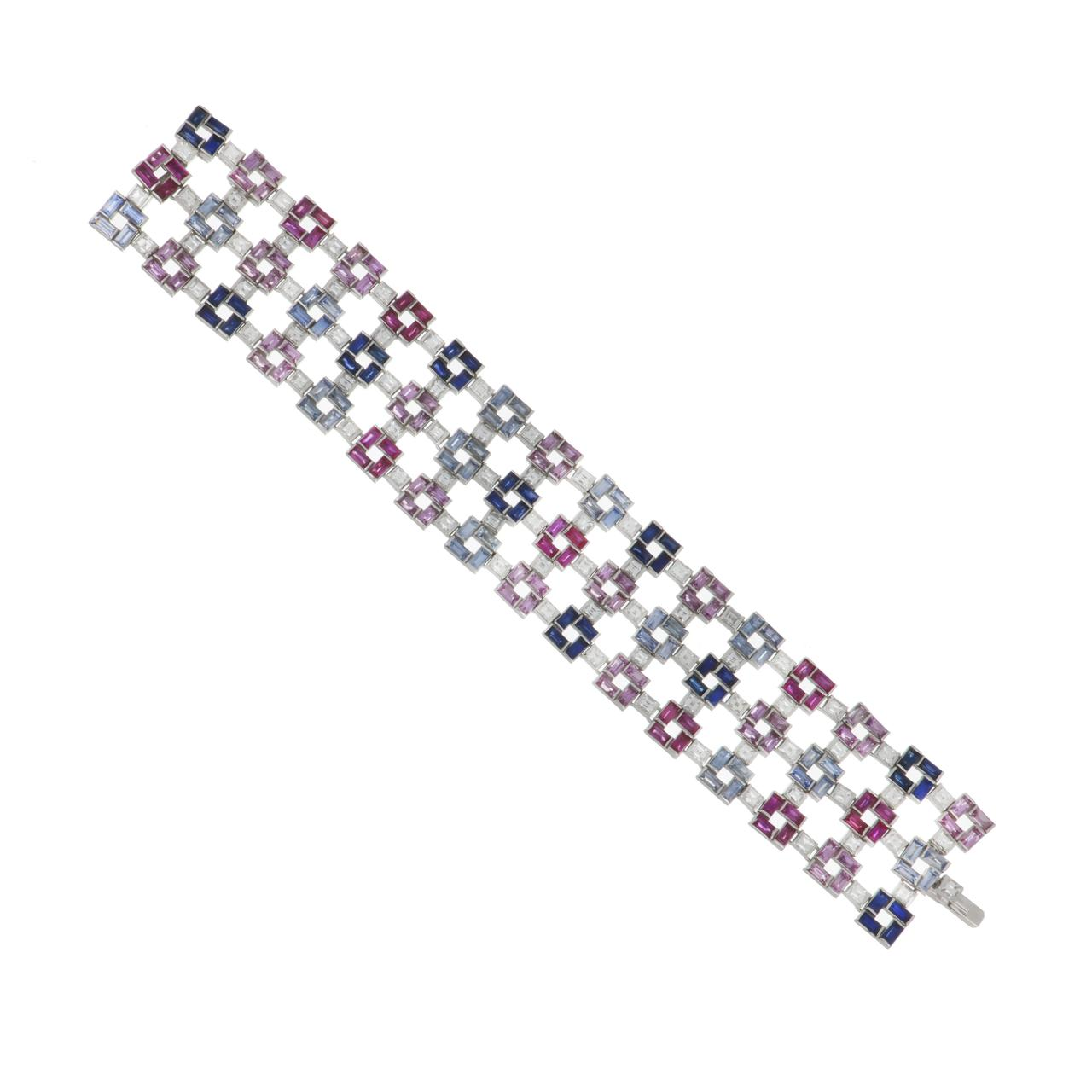 An estate Cantamessa geometric grid lace bracelet featuring pale pink, deep pink, pale blue, and deep blue sapphires, accented by step-cut diamonds and set in 18K white gold. Italy, circa 2000.