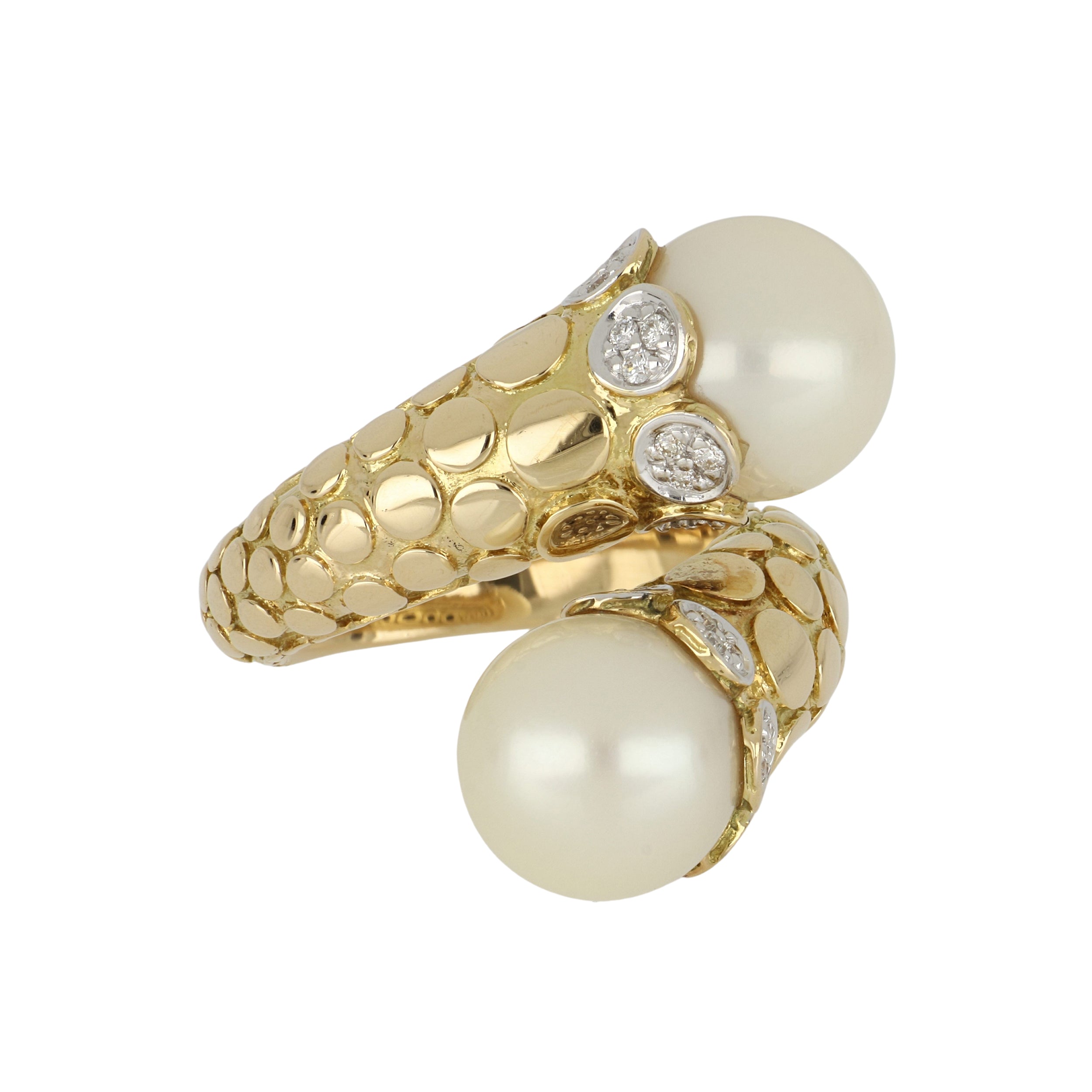 An estate John Hardy freshwater pearl and round diamond Toi et Moi ring, set in 18K yellow gold. Circa 2020.