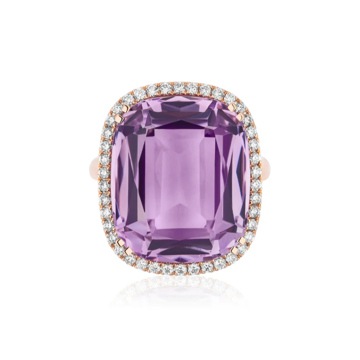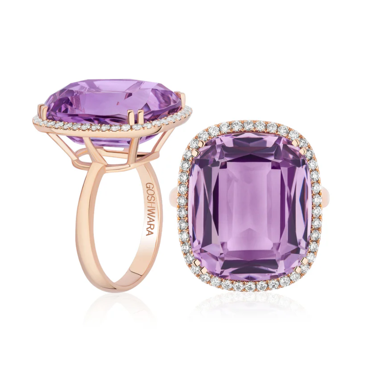 A Goshwara 'Gossip' Collection ring featuring a cushion-shaped lavender amethyst framed by round diamonds in 18K rose gold