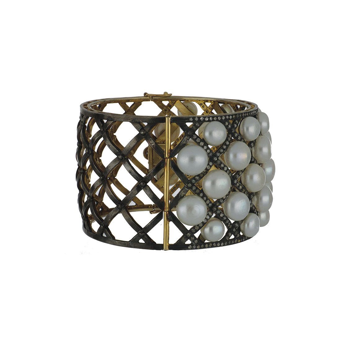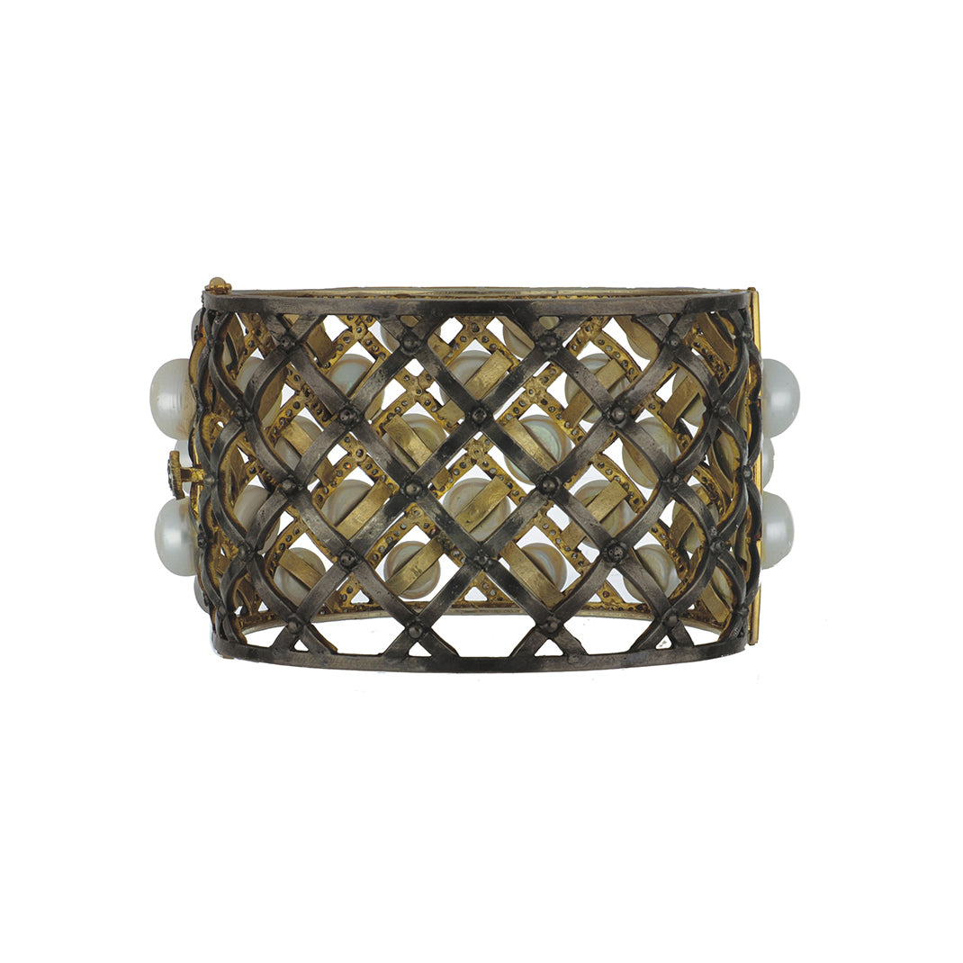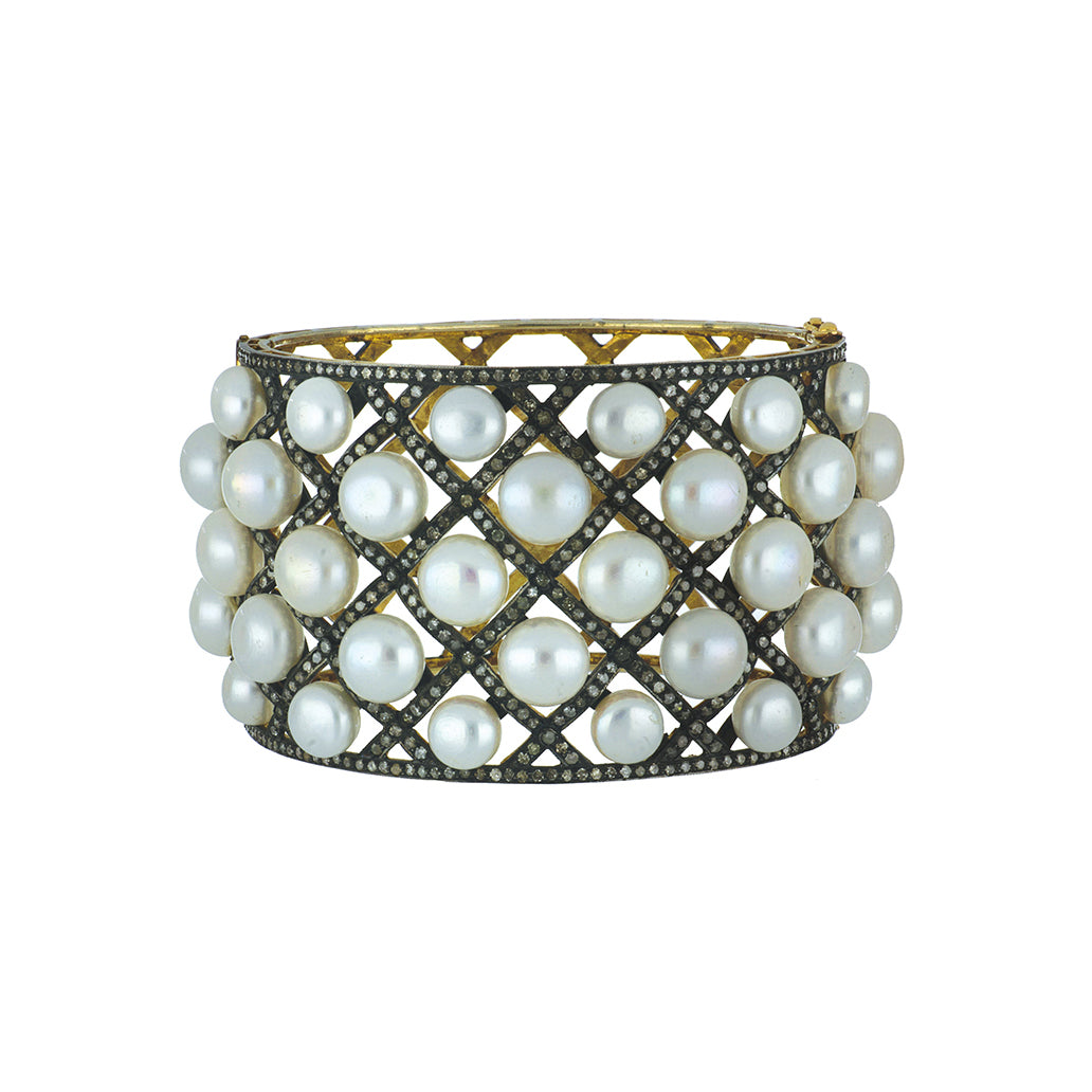 A Maharaja 14K yellow gold and sterling silver lattice work hinged bangle with pearls and diamonds.