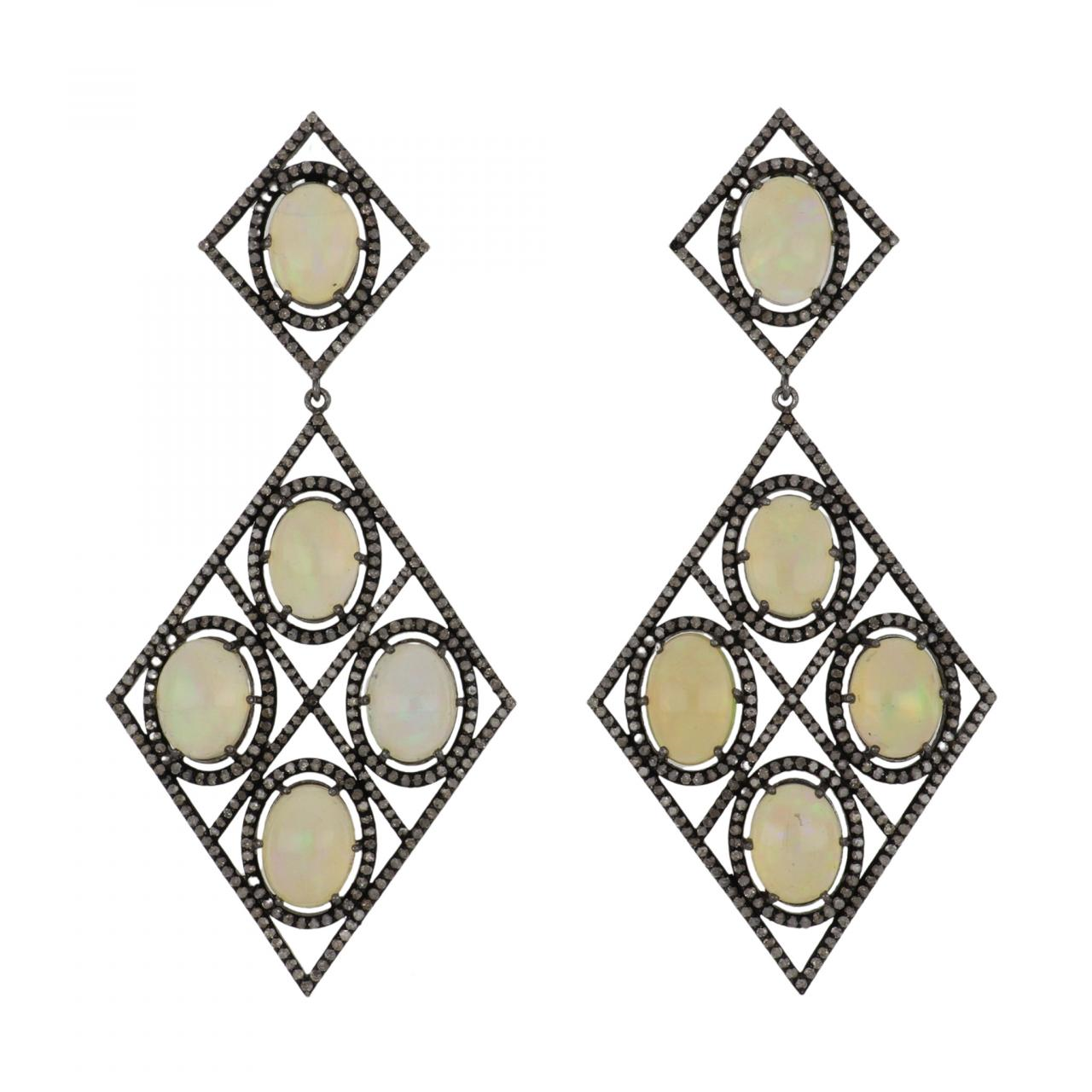 A Maharaja pair of oversized kite shaped drop earrings with cabochon opals and diamond accents, set in sterling silver.Official RetailerLength: 3.75 inches