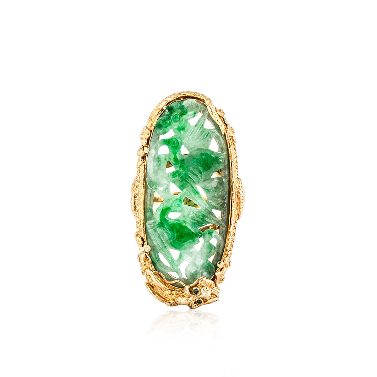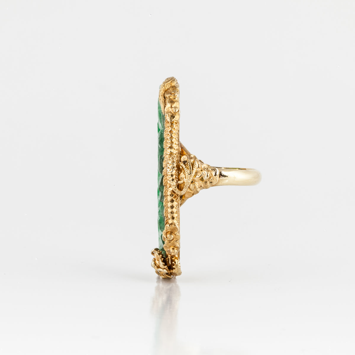 An antique, Mid-Century elongated carved jadeite ring with decorative foo dog border set in 22k yellow gold. Circa 1960.