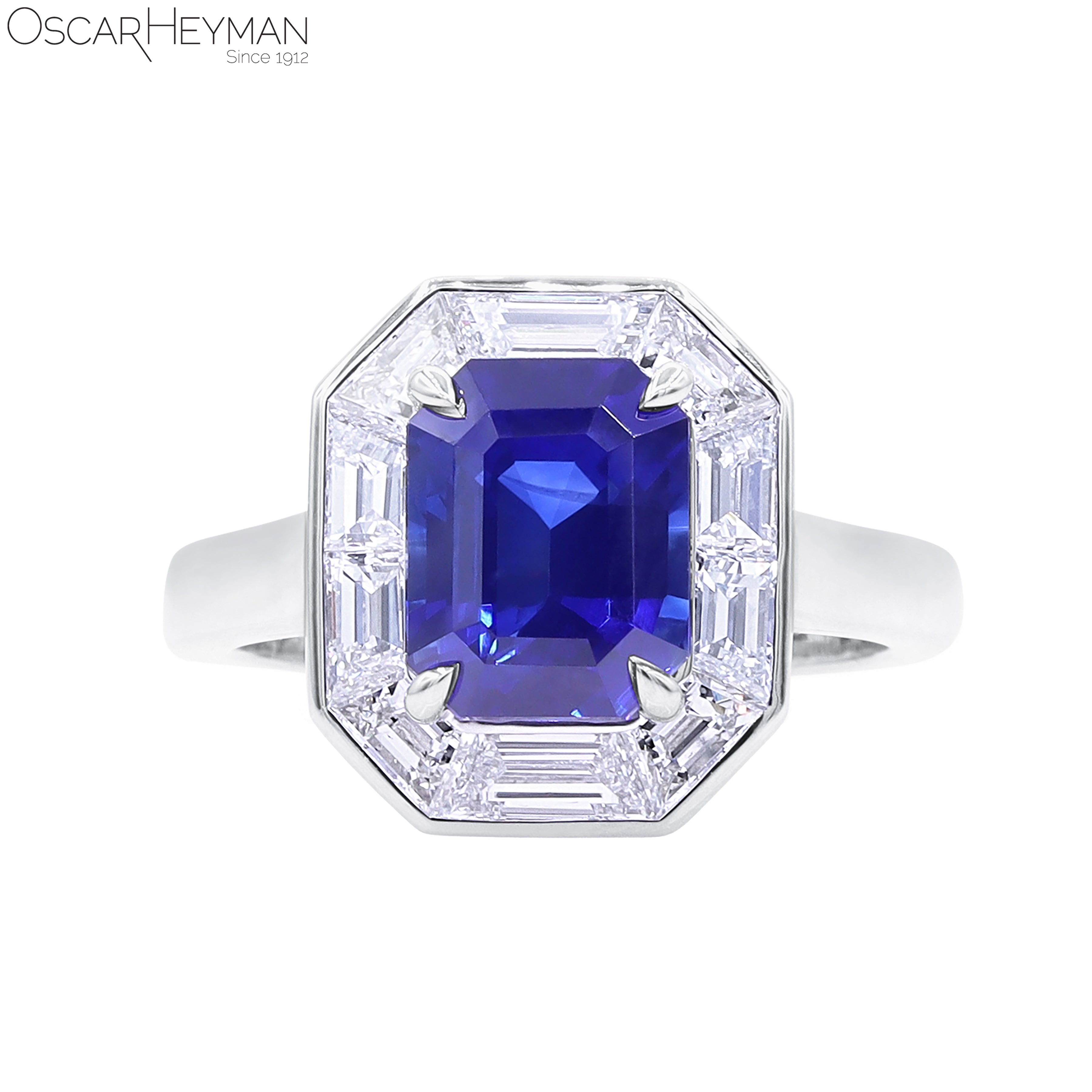 An Oscar Heyman royal blue Ceylon sapphire and calibre-cut diamond halo ring set in platinum. Signed: Oscar Heyman.