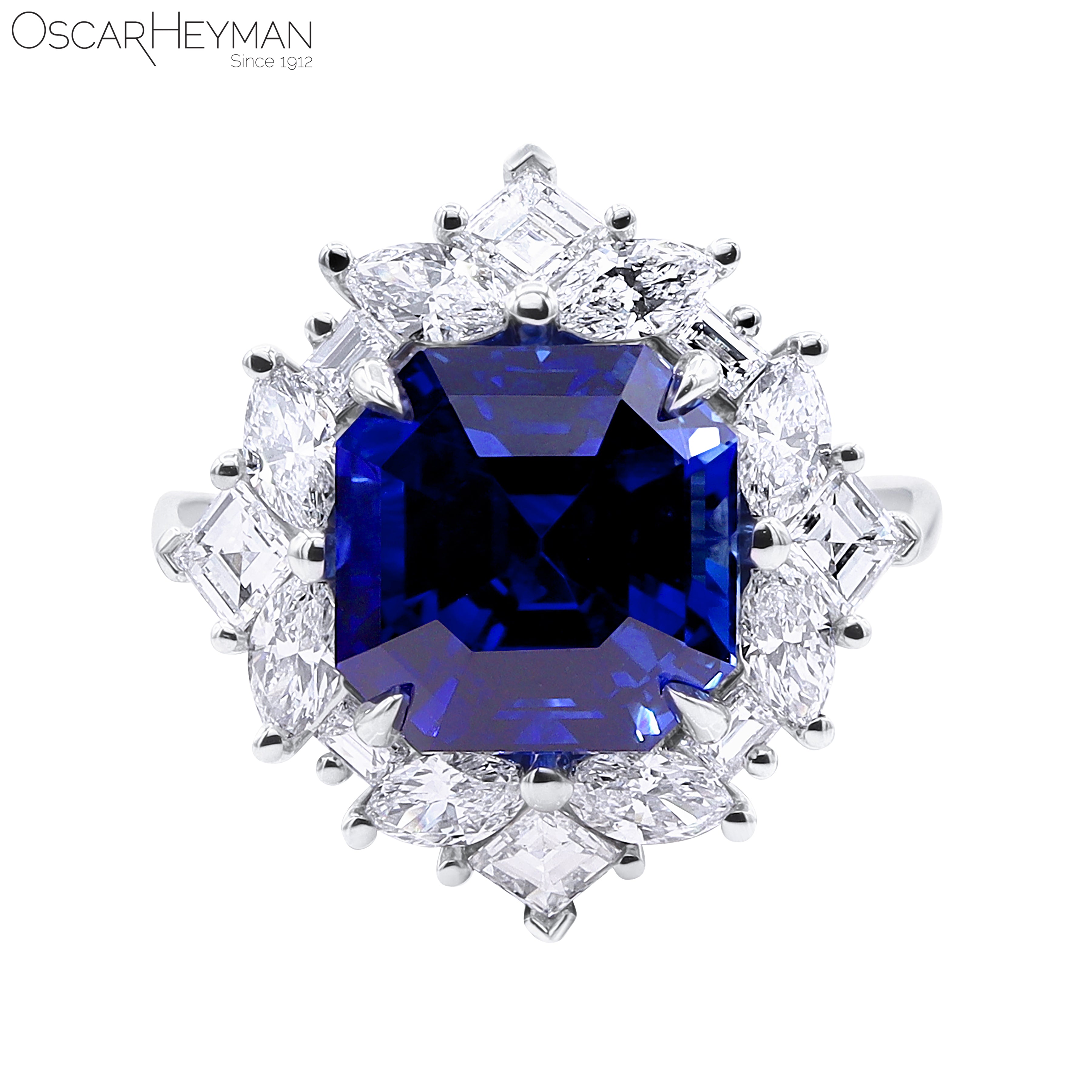 An Oscar Heyman cocktail ring featuring a vivid blue Ceylon sapphire framed by multi-shaped diamonds, set in platinum. Signed: Oscar Heyman.