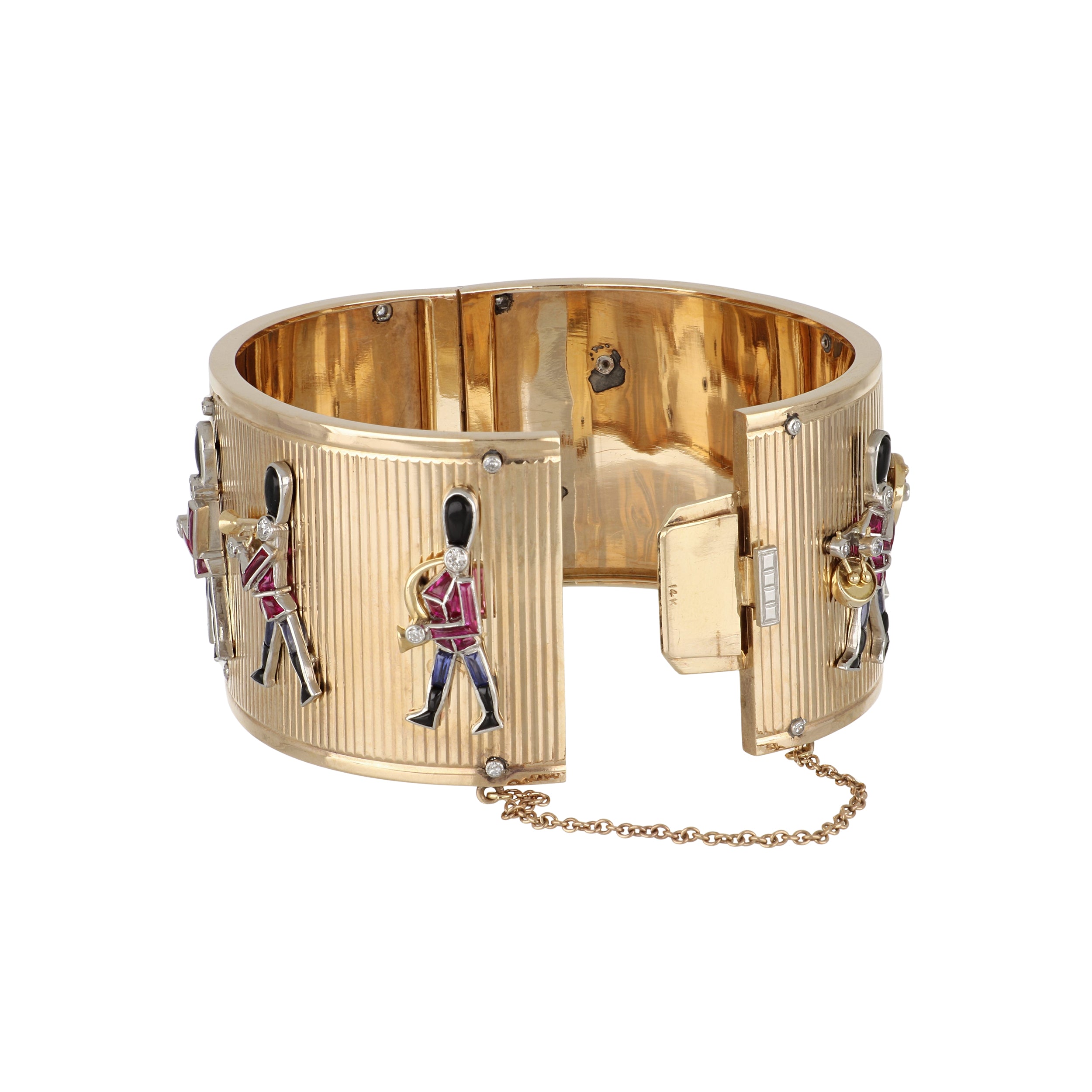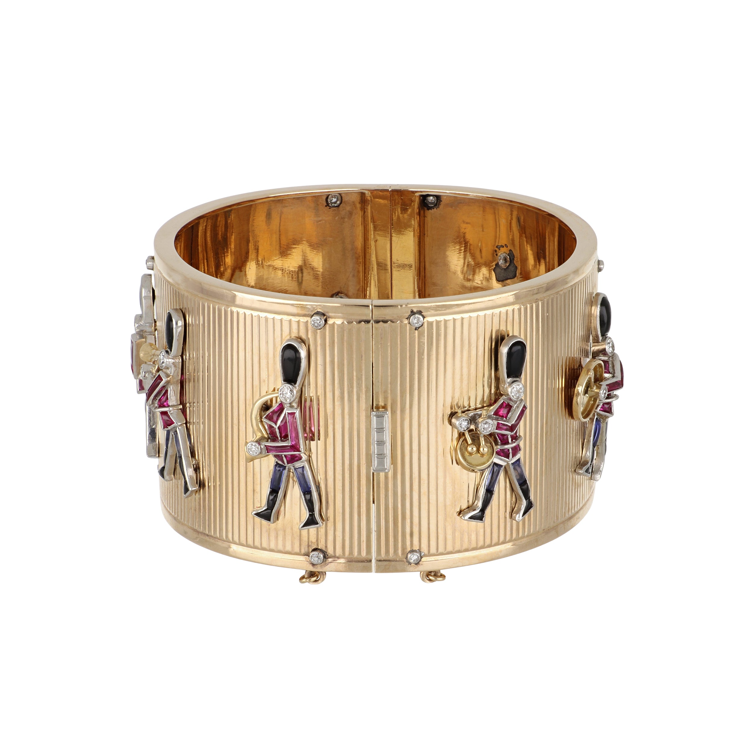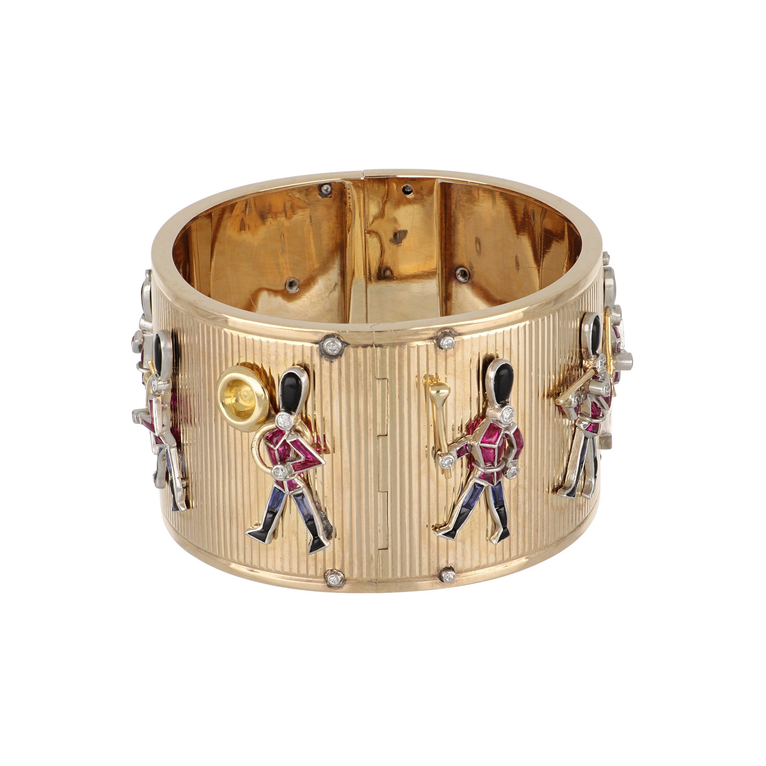 An antique wide hinged bangle featuring grenadier guards in gem set motifs with synthetic calibre-cut rubies, synthetic sapphires, carved onyx and old cut round diamonds, set in 14K yellow and white gold. Circa 1940
