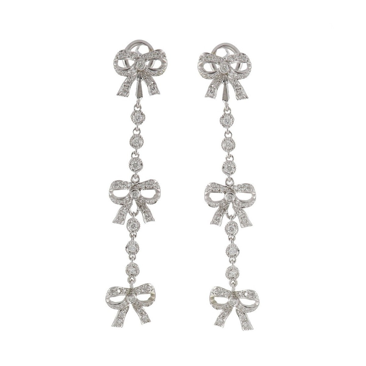 A pair of triple bow diamond drop earrings, set in 18K white gold.Tenenbaum Workshop CollectionRound diamonds: 1.02 total carat weightF-G color, VS2-SI1 clarityLength: 2.50" inches - alterable
