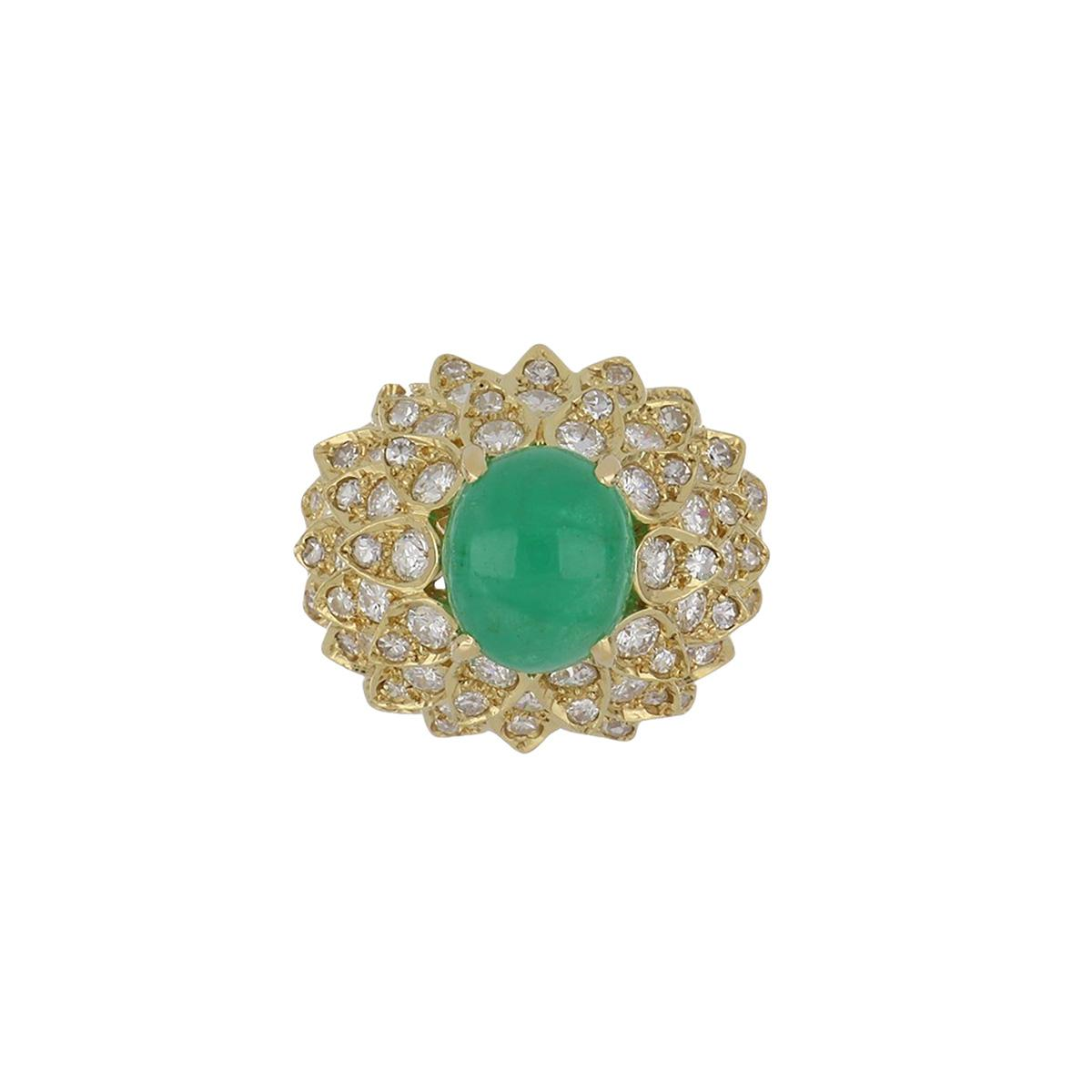A vintage feather motif diamond ring with oval cabochon emerald center, set in 18K yellow gold. Circa 1970.