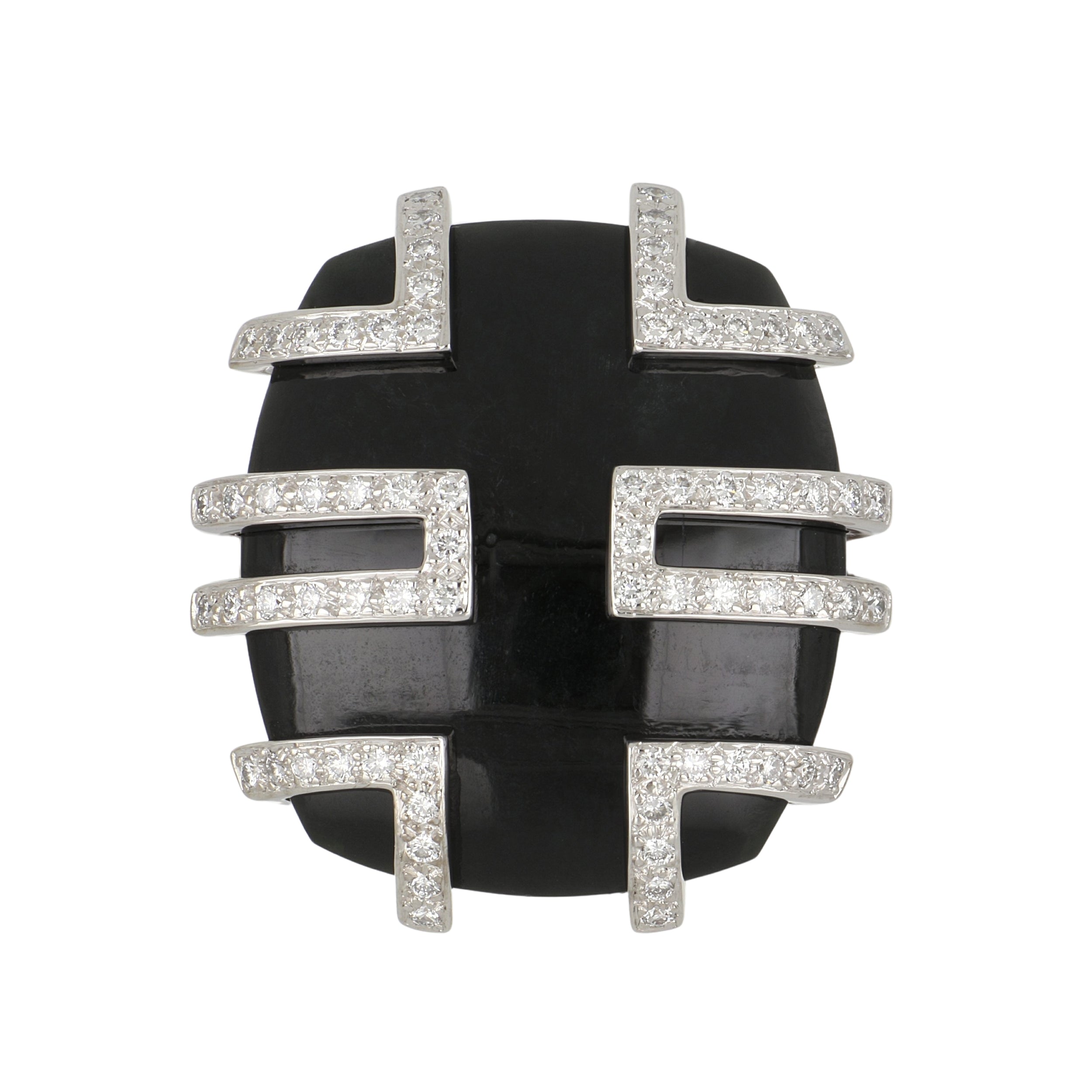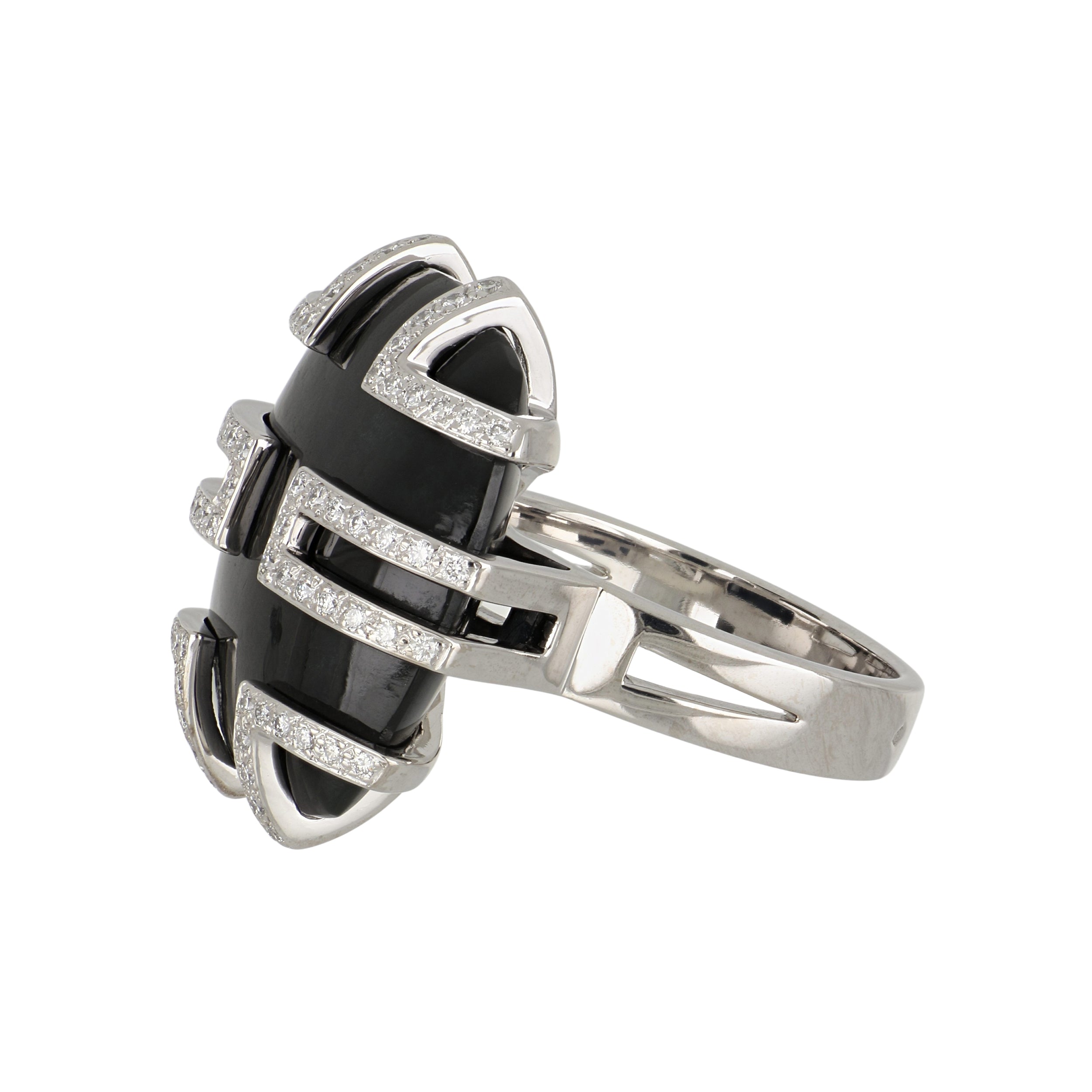 A vintage Cartier "La Baiser Du Dragon" black jadeite ring with round brilliant-cut diamonds, set in 18K white gold. Circa 1990. Signed: Cartier.