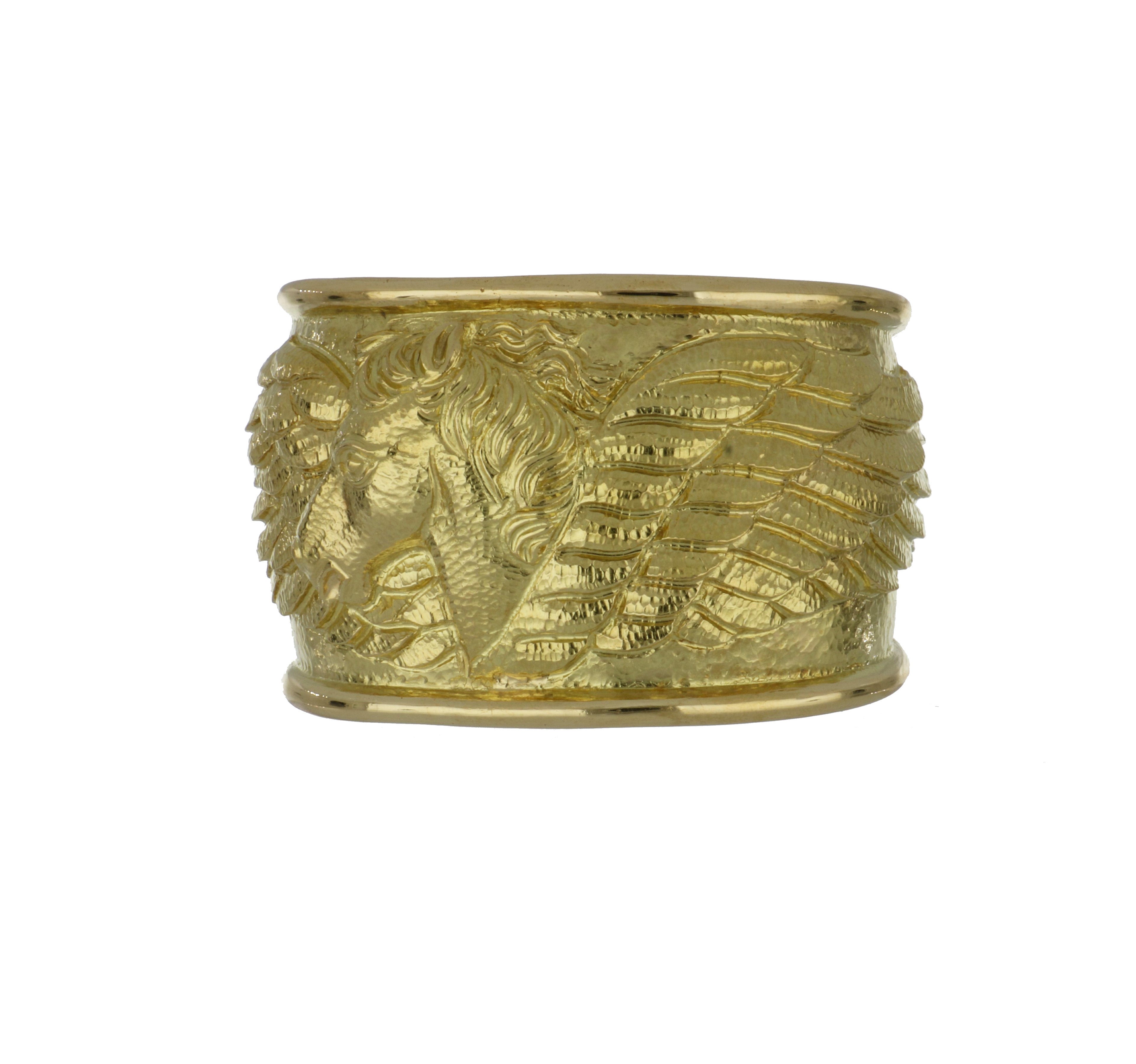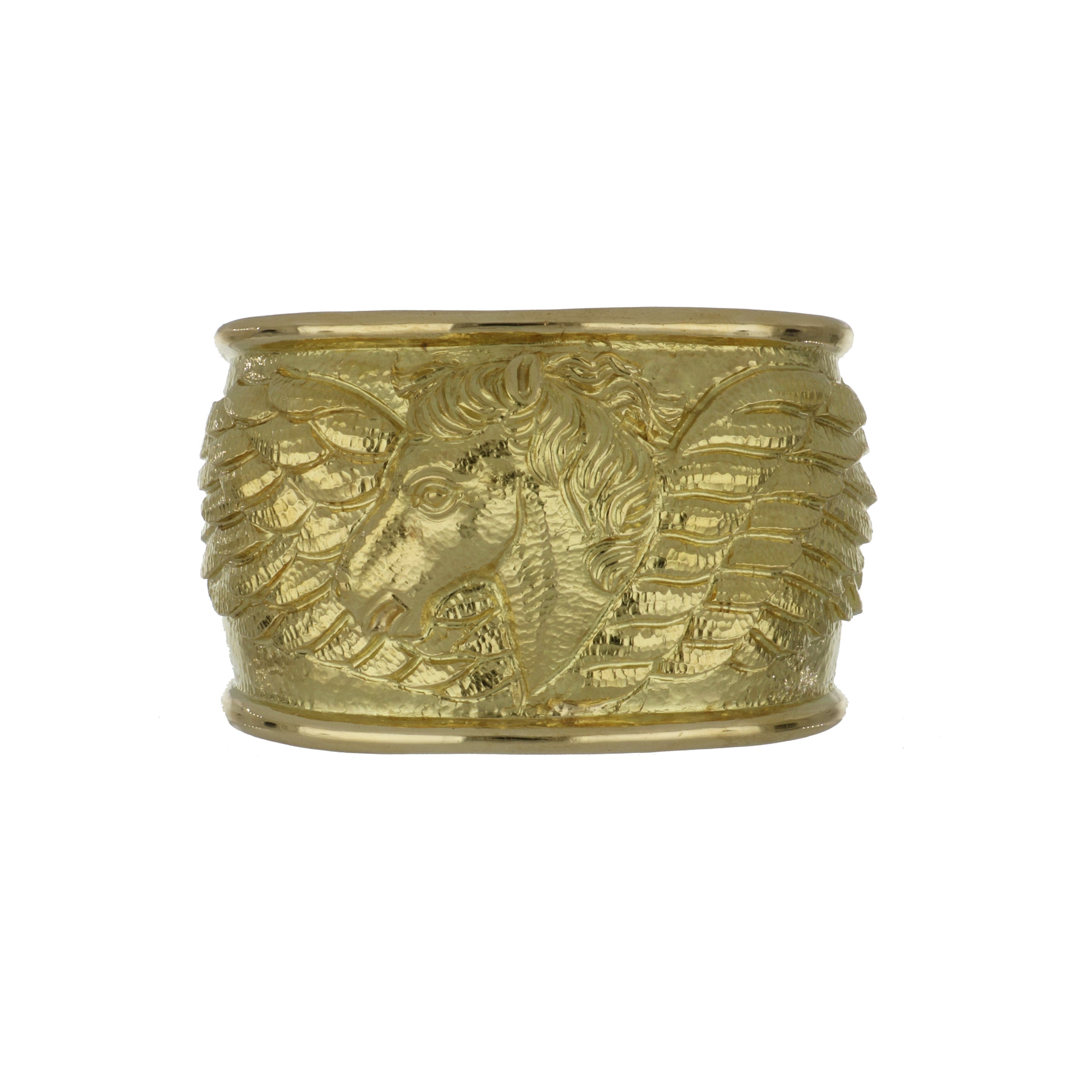 A vintage David Webb Pegasus cuff in 18k yellow gold with a hammered texture. Circa 1980.Vintage & Estate Collection