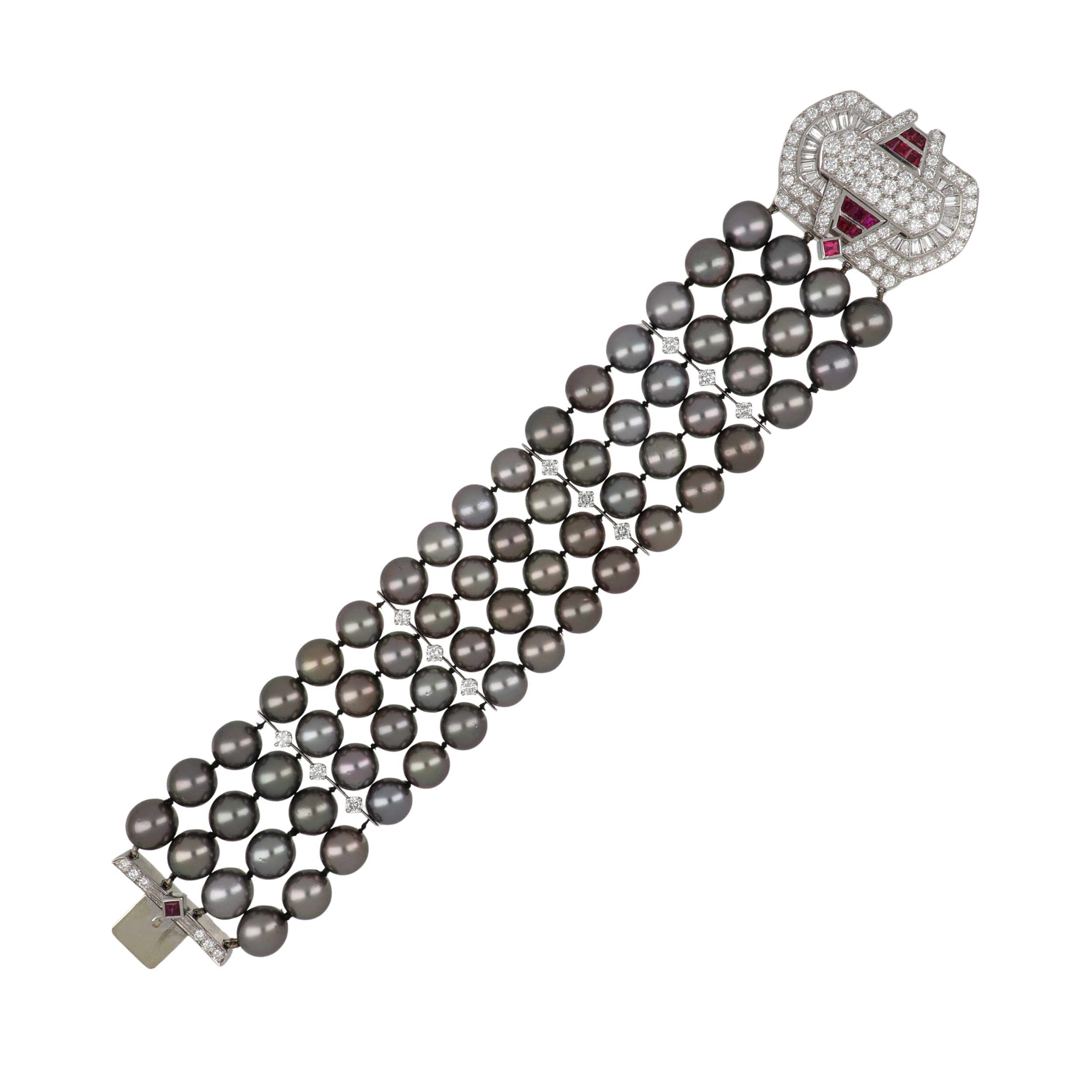 A vintage David Webb four-strand Tahitian pearl bracelet with diamonds and rubies, set in 14K white gold and platinum. From the Twilight Collection. Circa 1990.