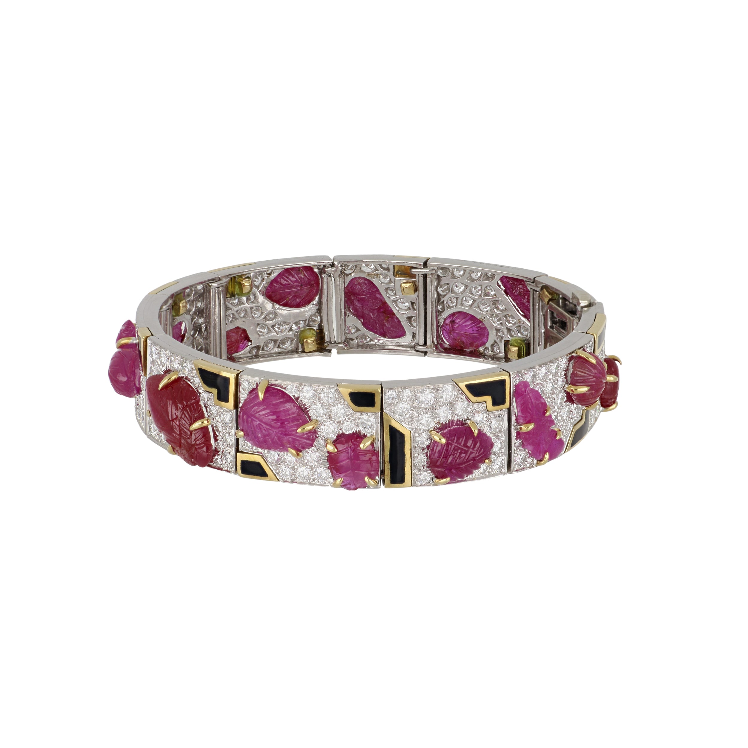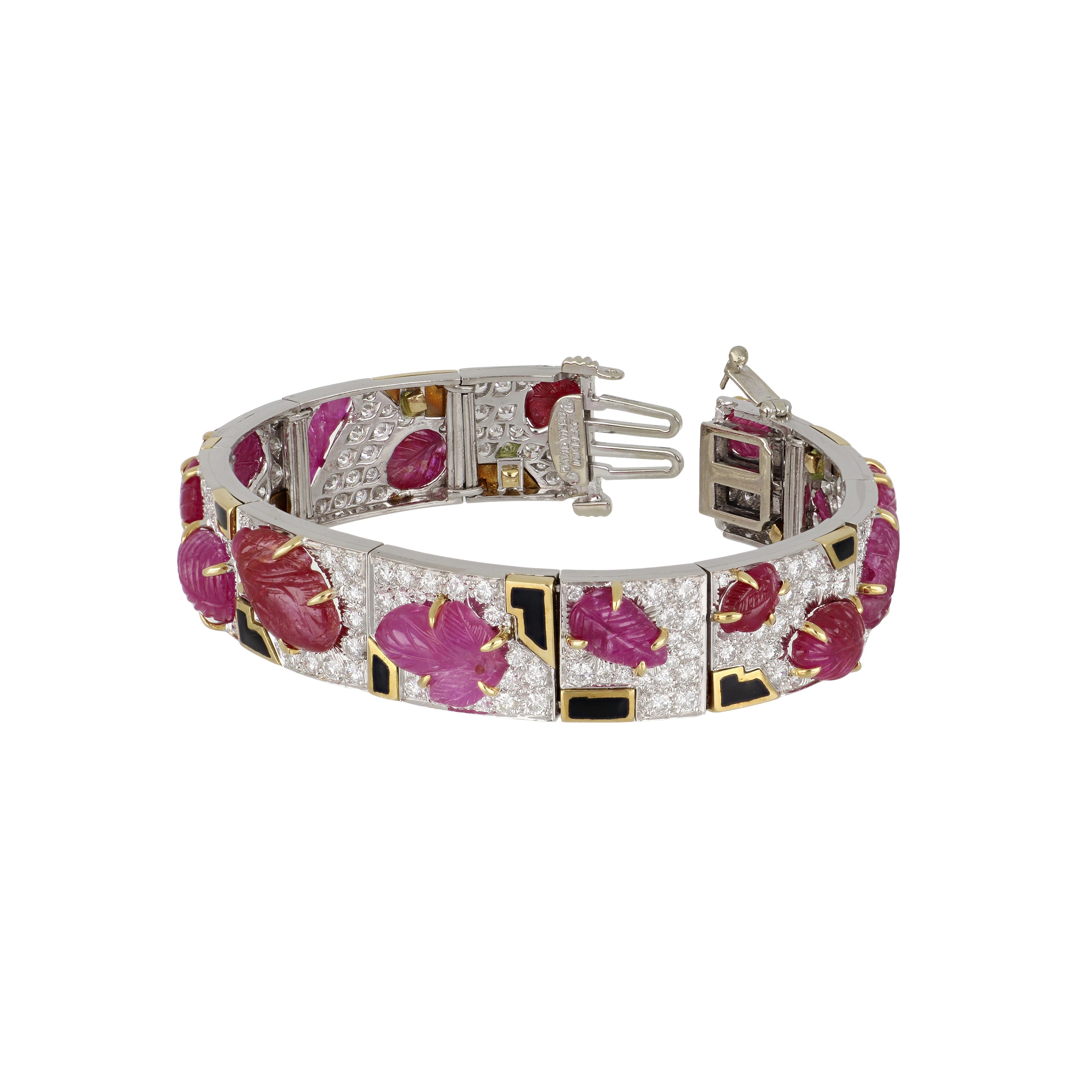 A vintage David Webb bracelet with carved rubies, round diamonds and black enamel, in 18K yellow gold and platinum. From the Colors Collection. Circa 1990.