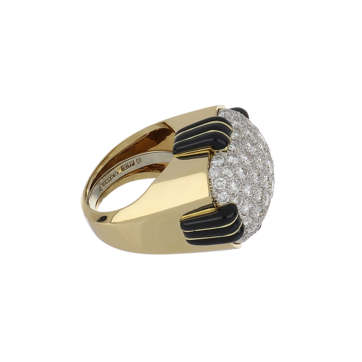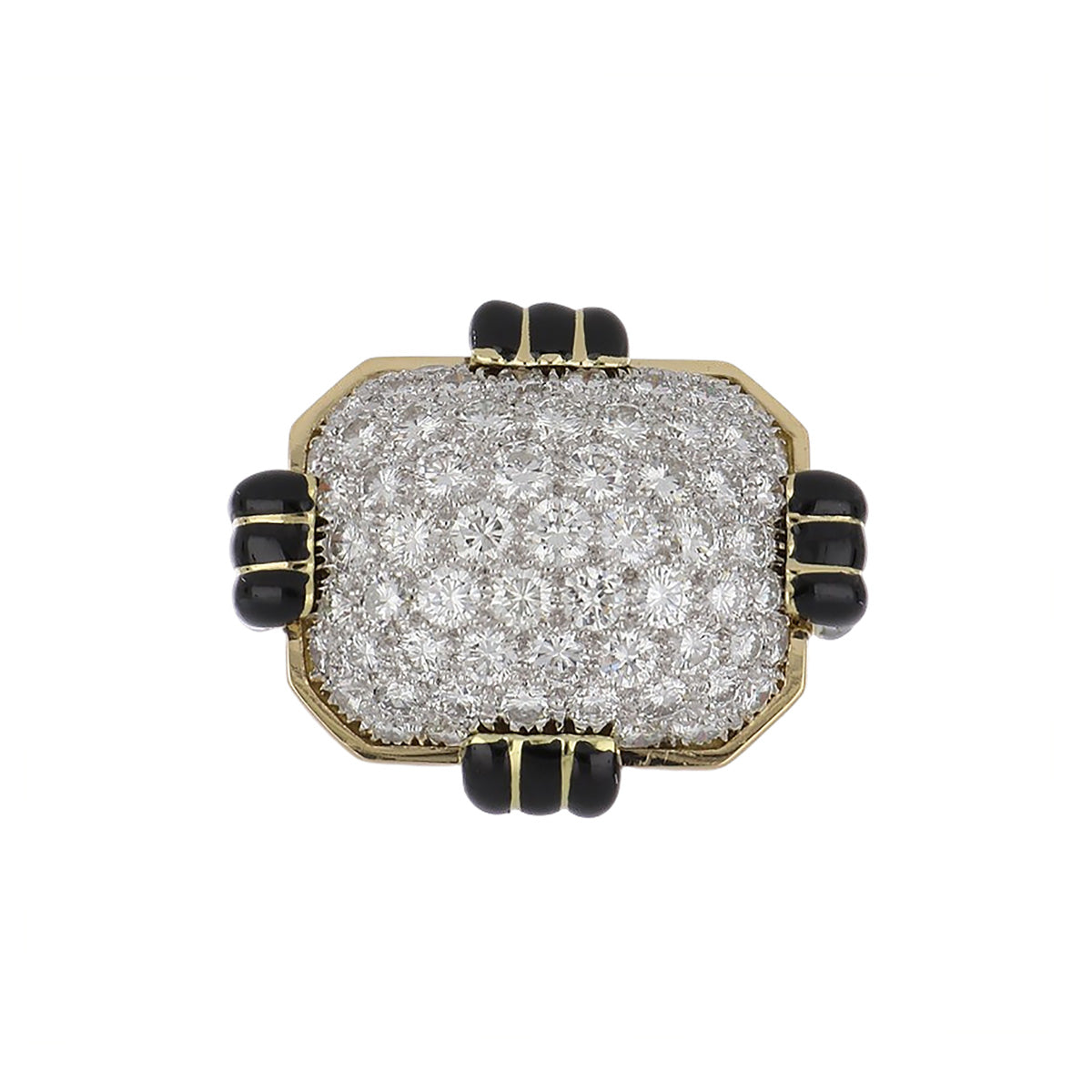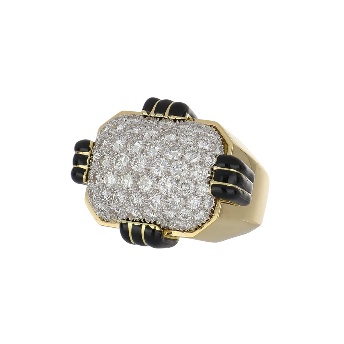 A vintage David Webb pave diamond ring with black enamel accents, set in platinum and 18K yellow gold. From the Manhattan Minimalism Collection. Circa 1980.