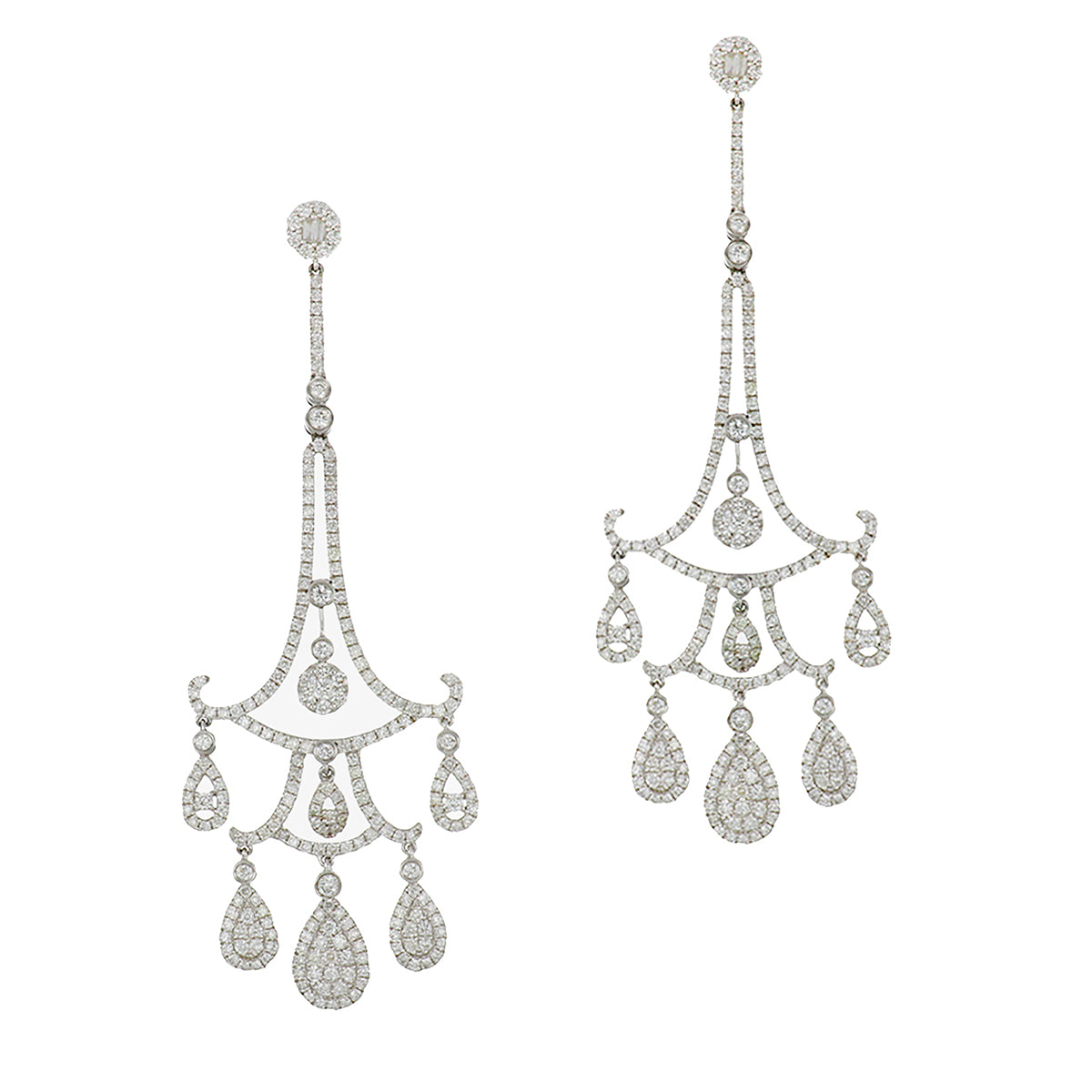 A pair of estate round brilliant-cut diamond chandelier earrings, set in 14k white gold. Circa 2010.