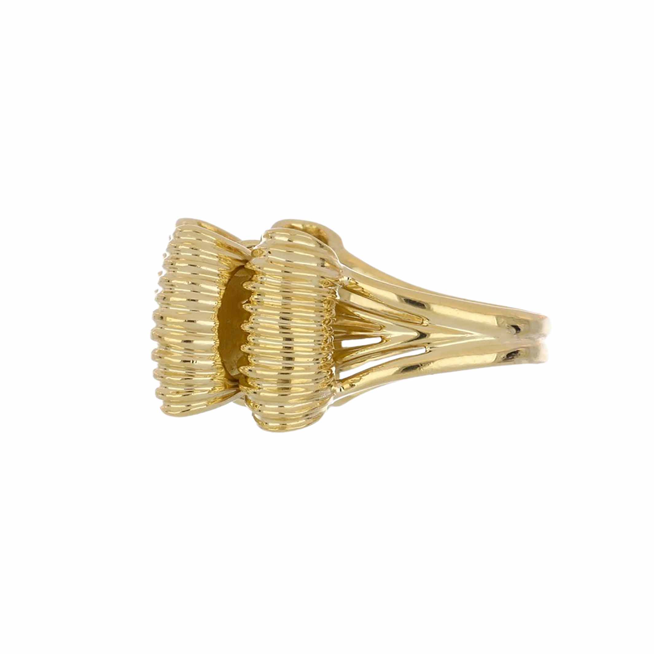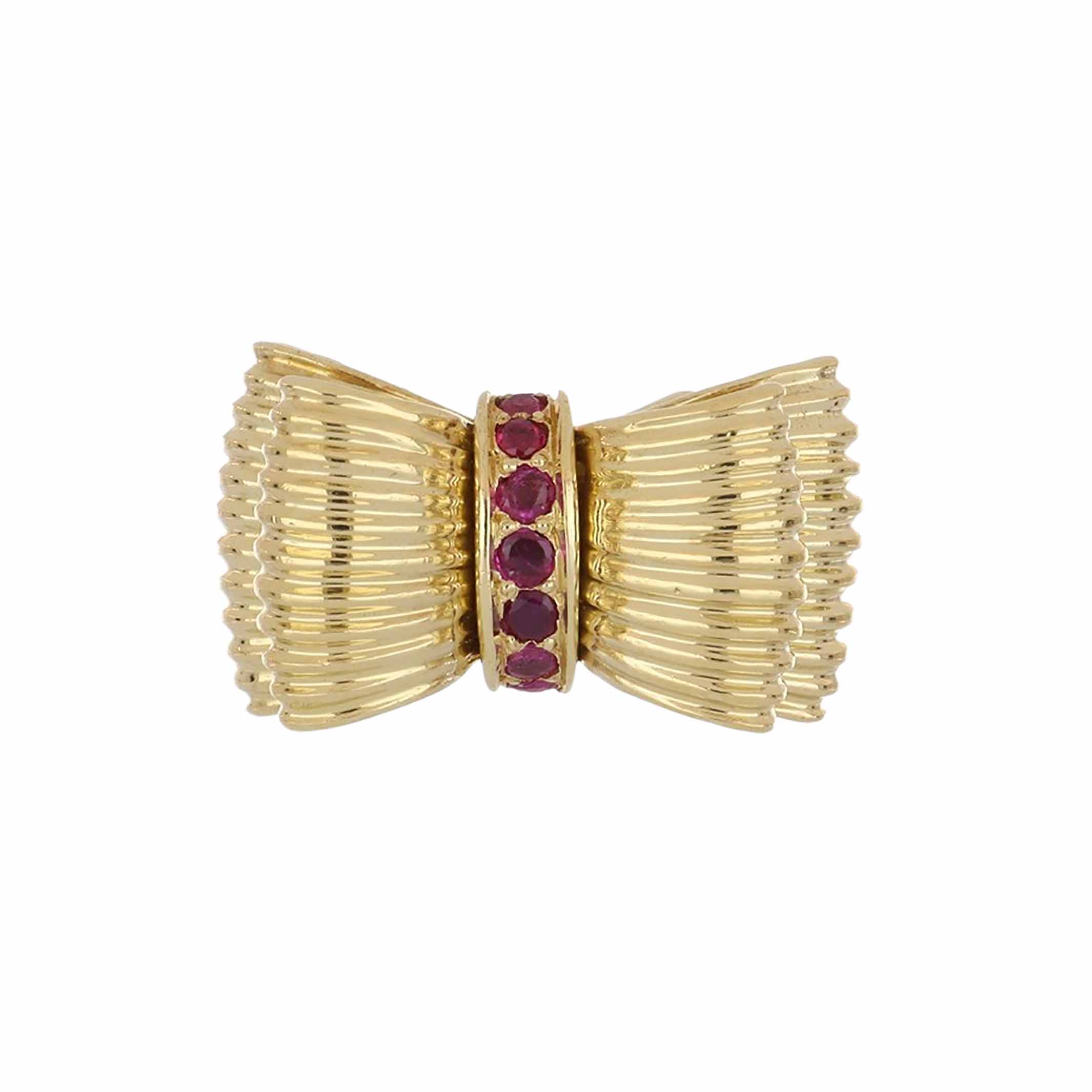 A vintage Tiffany & Co. double stacked ribbon ring with accordion fabric design and rubies, set in 18K yellow gold. Circa 1970.
