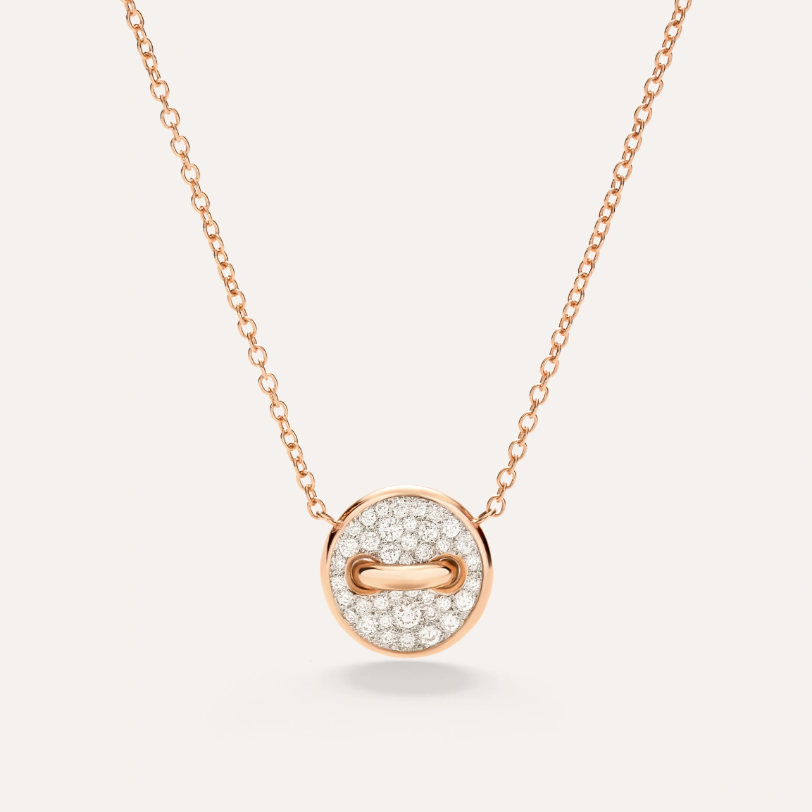 A Pomellato white mother-of-pearl and pave round brilliant-cut diamond Pom Pom Dot reversible pendant necklace, set in 18K rose gold. Made in Italy.