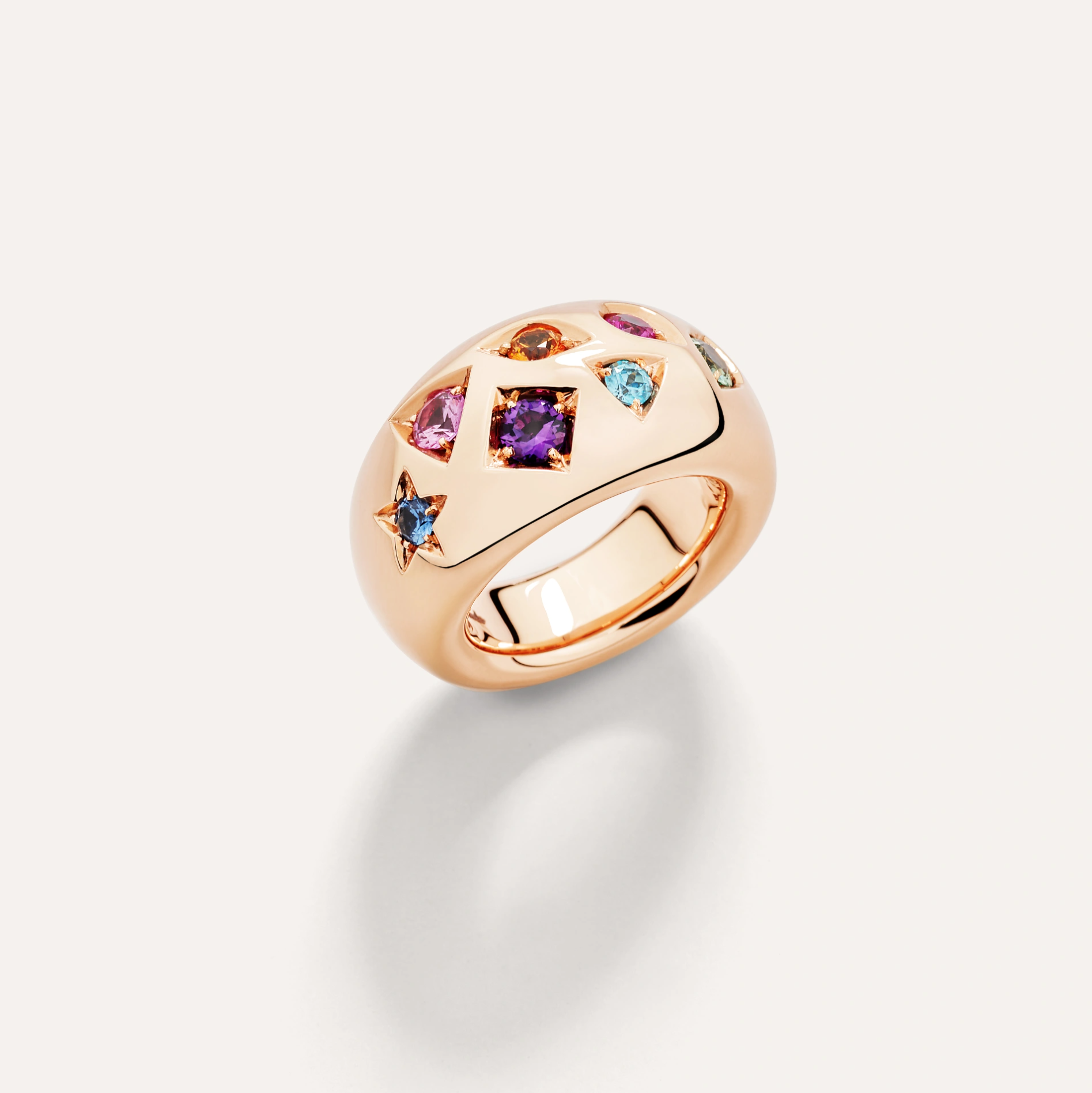 A Pomellato Iconica multicolored gemstone cocktail ring featuring multicolored sapphires, ruby, amethyst and zircon, set in 18K rose gold.