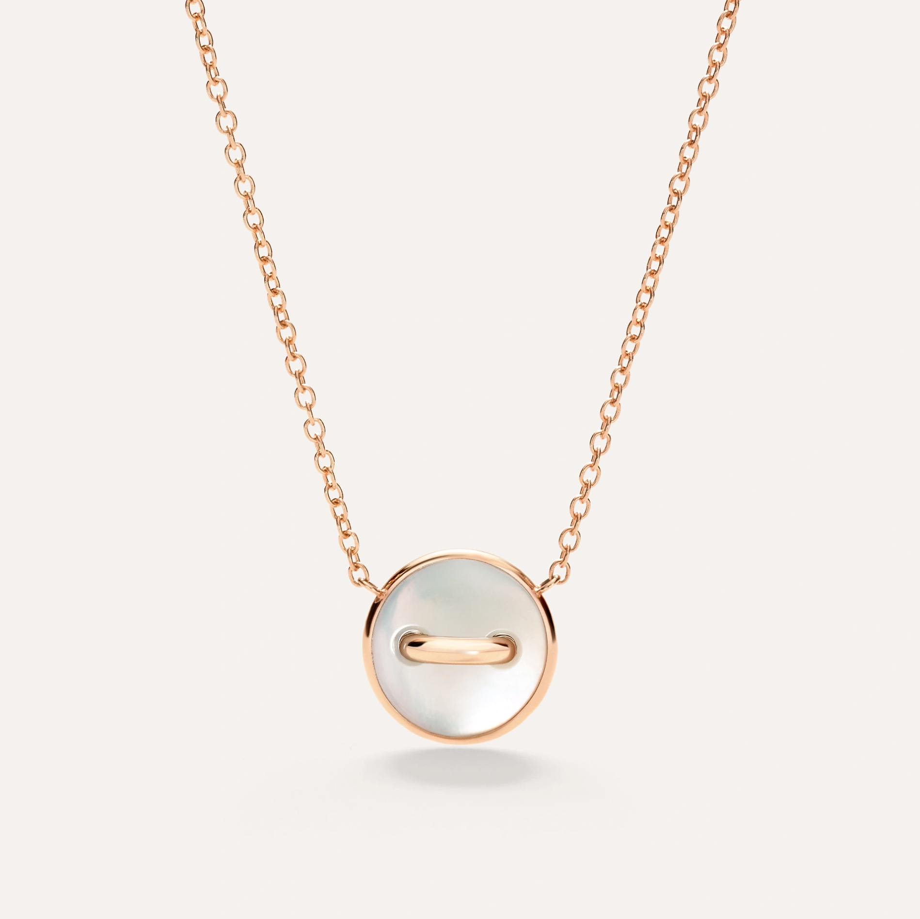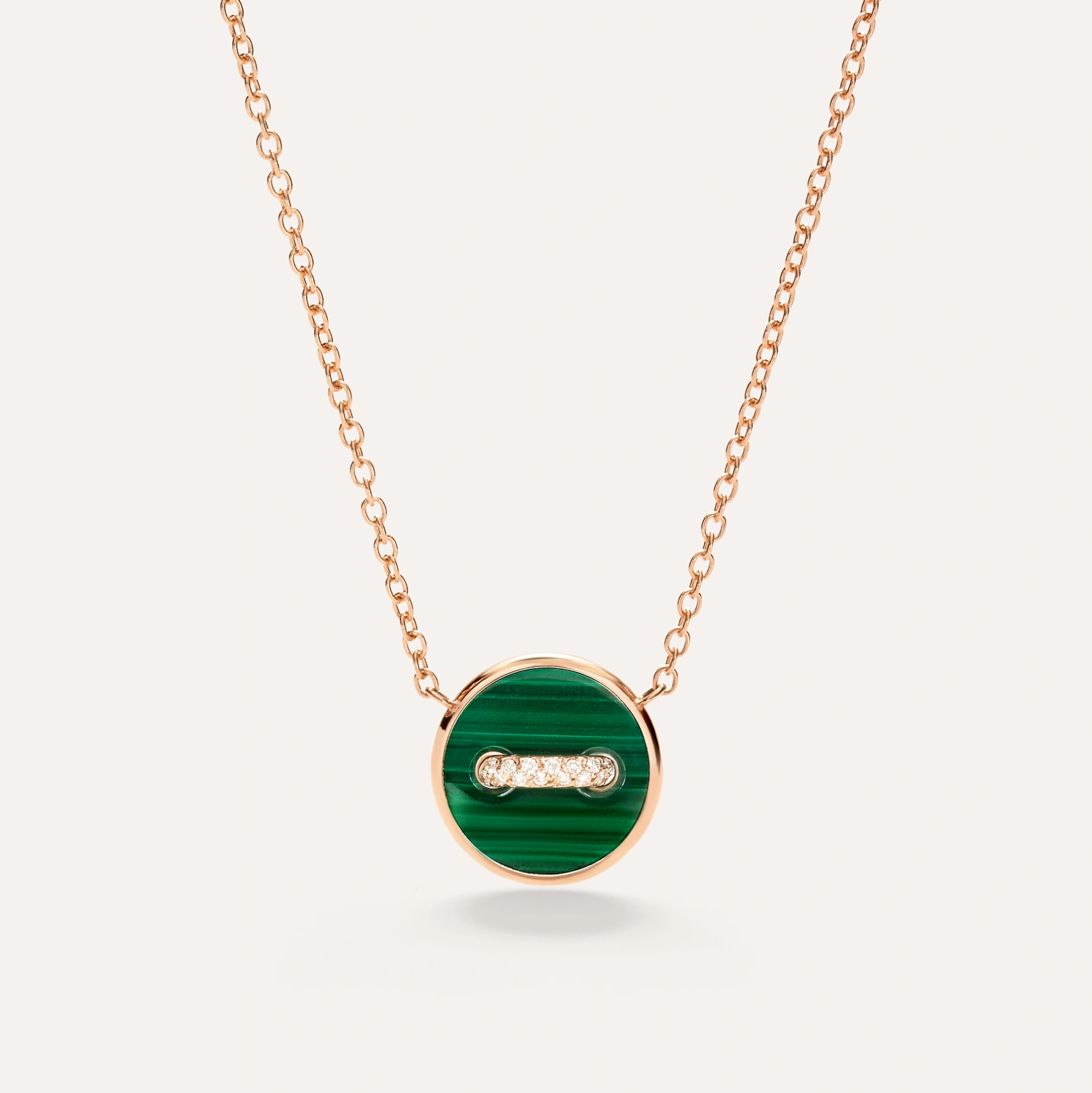 A Pomellato malachite and mother-of-pearl Pom Pom Dot reversible necklace with accent diamonds, set in 18K rose gold. Made in Italy.