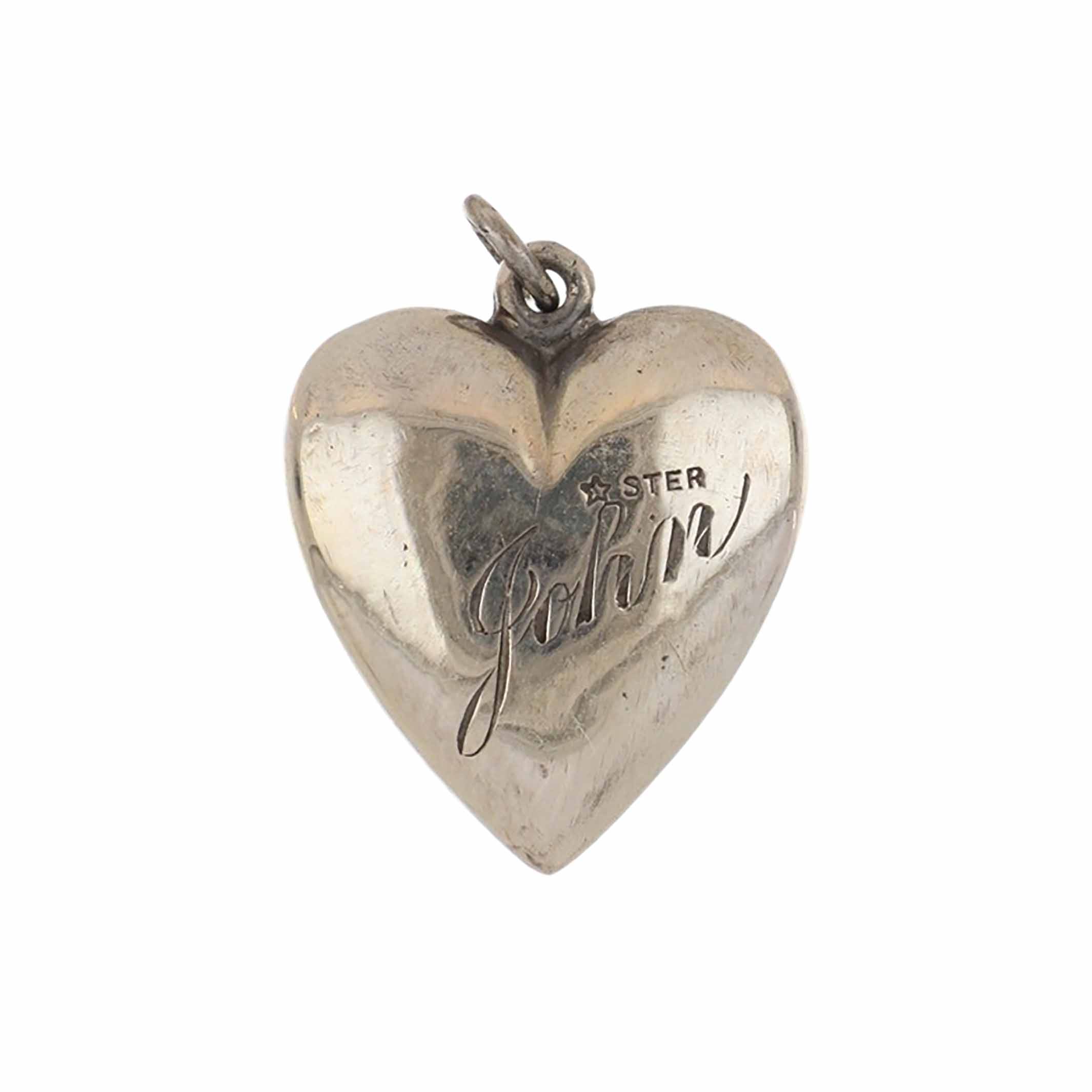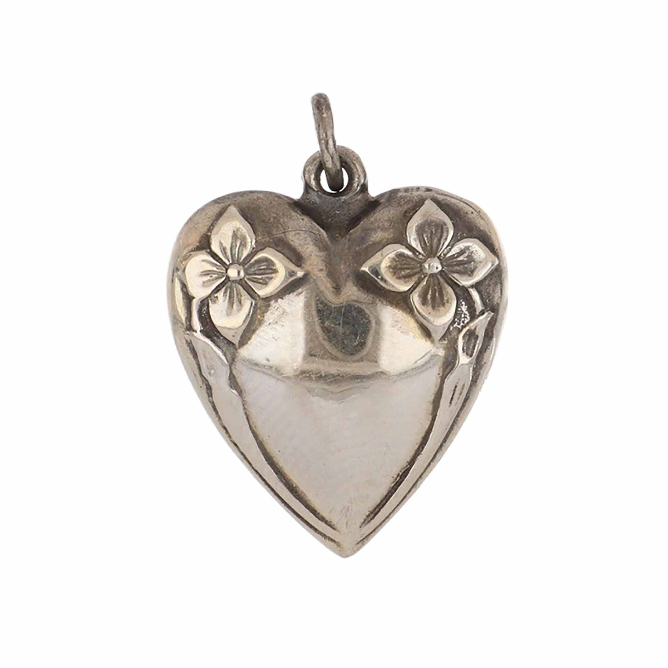 A sterling silver heart flower charm with an engraving on the back. Circa 1940.Antique Collection