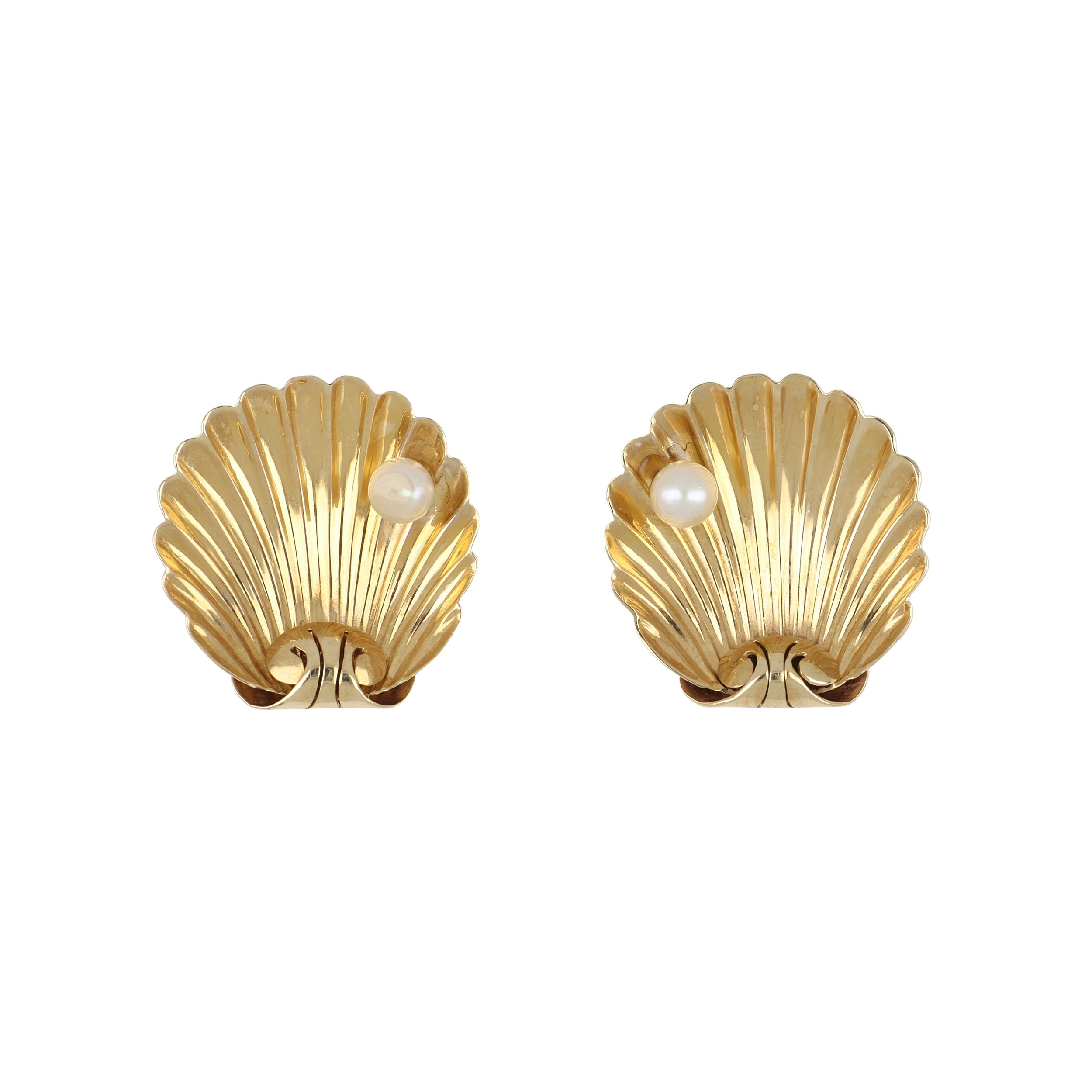 A pair of Retro 14K yellow gold shell earrings with single pearl accents. Circa 1940.