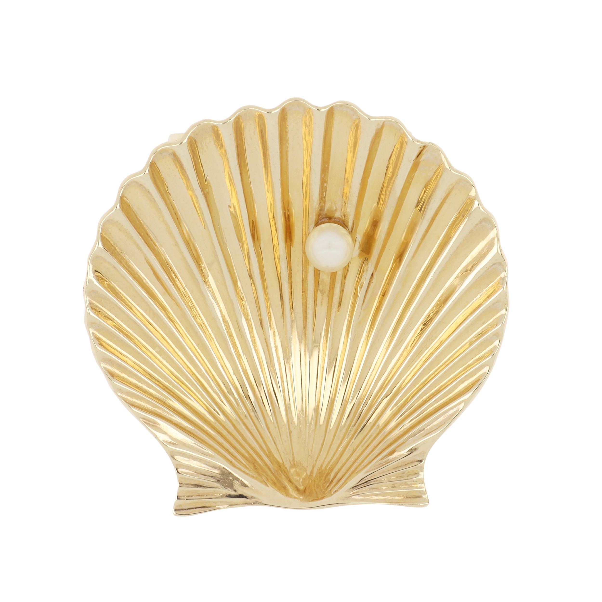 A Retro Cartier 14K yellow gold shell brooch with a single pearl. Circa 1940.