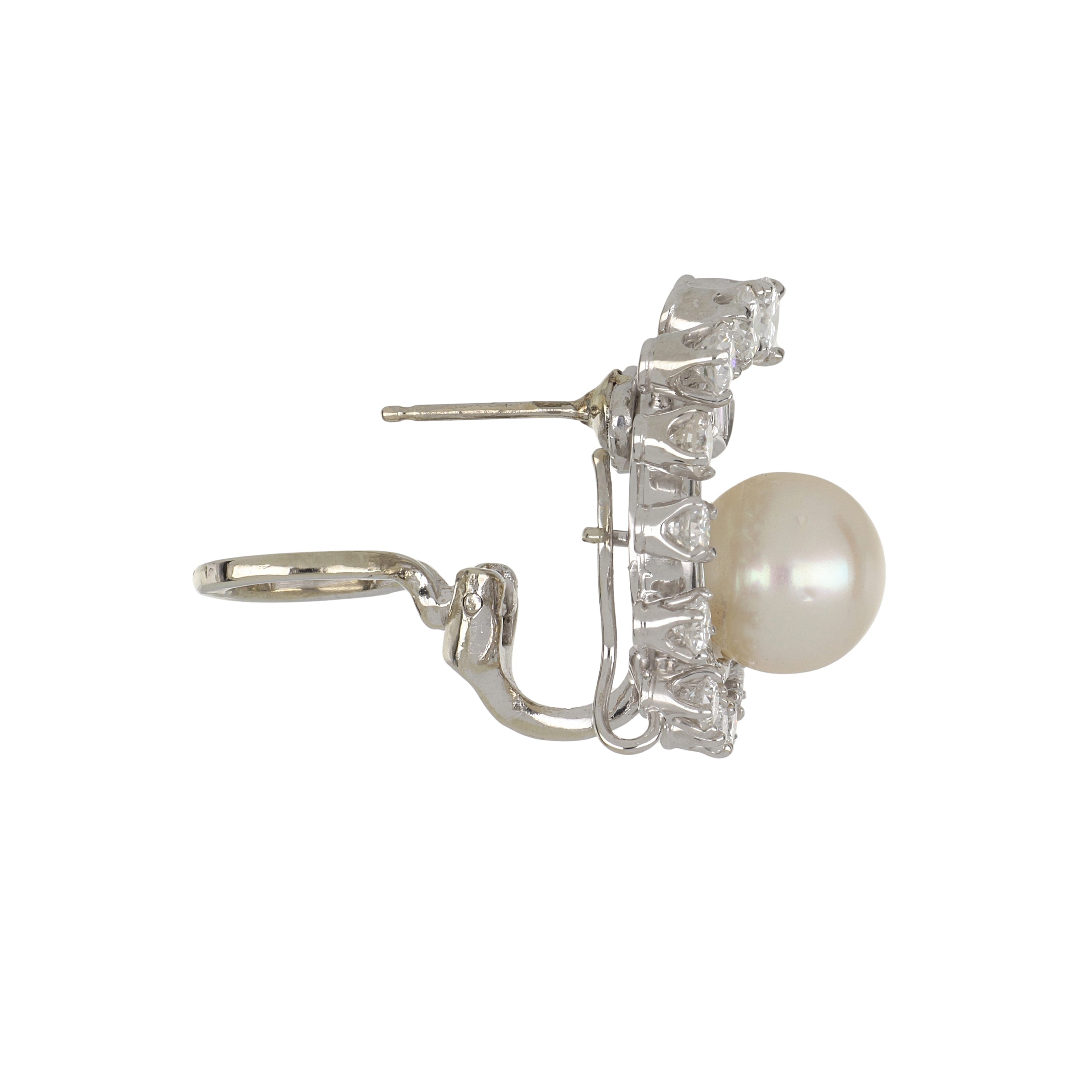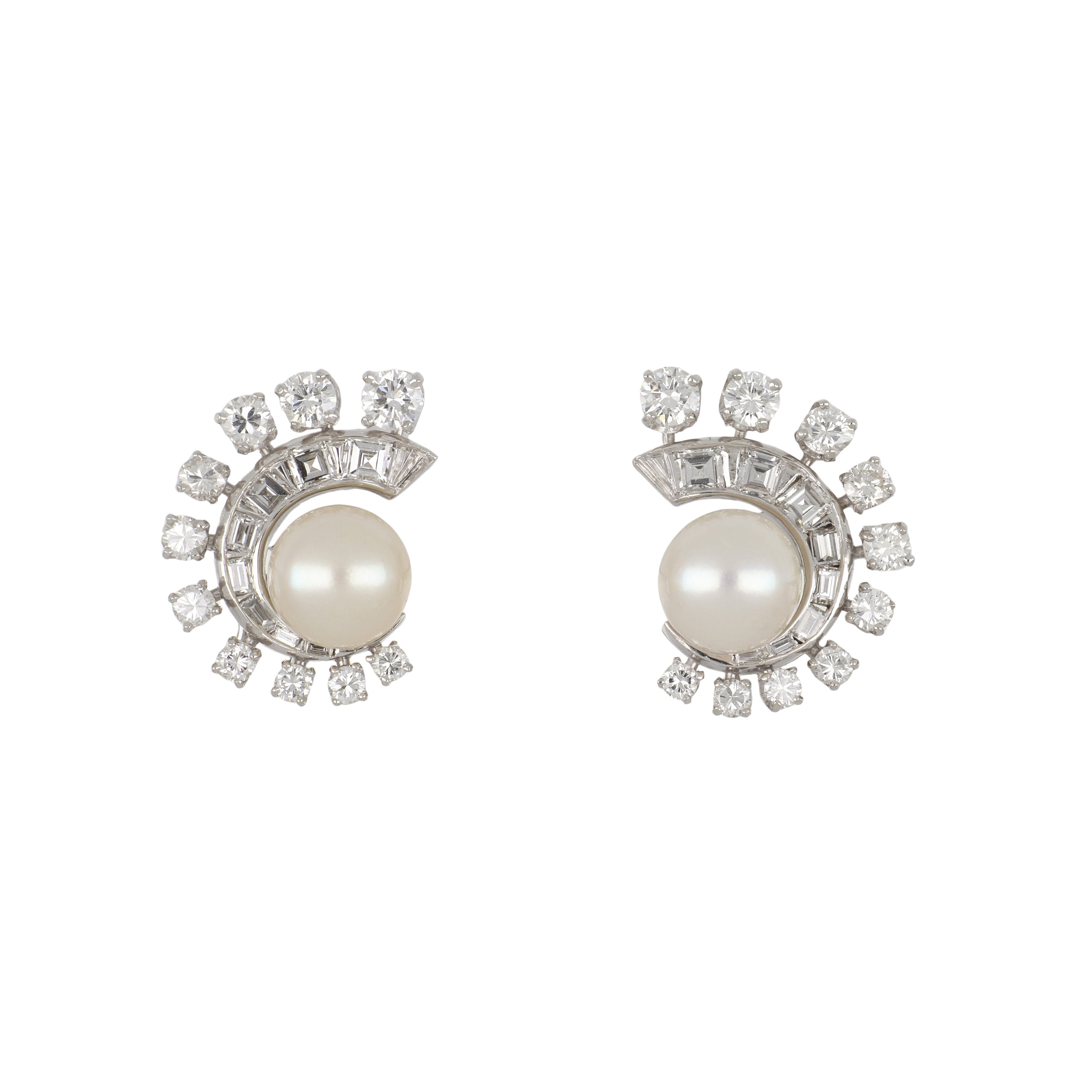 An pair of retro swirl clip pearl and diamond earrings with day/night wires in platinum. Circa 1940.