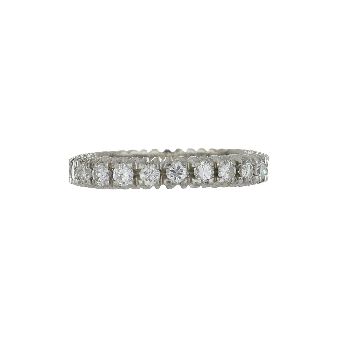 An estate antique, Retro four prong-set round diamond eternity band in platinum.