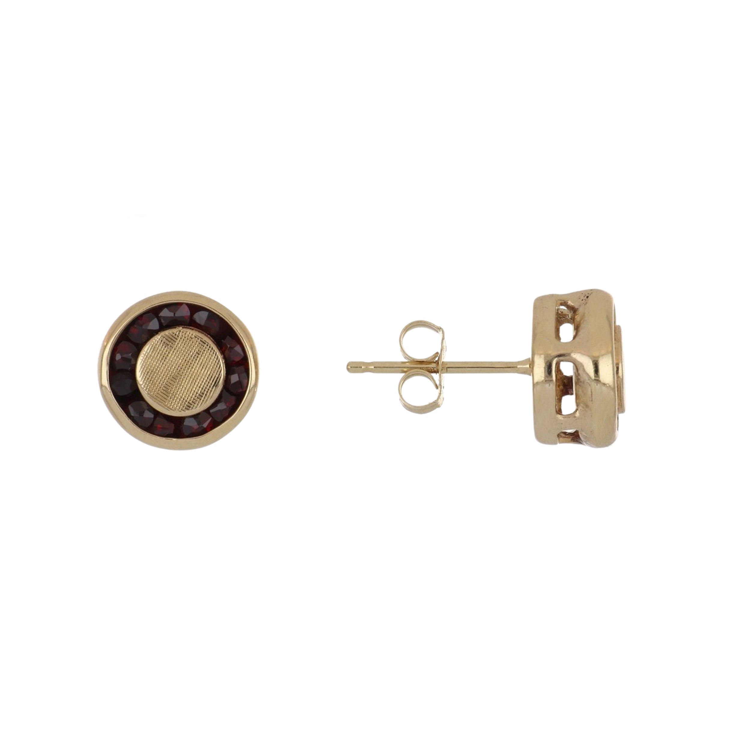 A pair of round garnet target-style earrings with a textured gold center, set in 14K yellow gold.