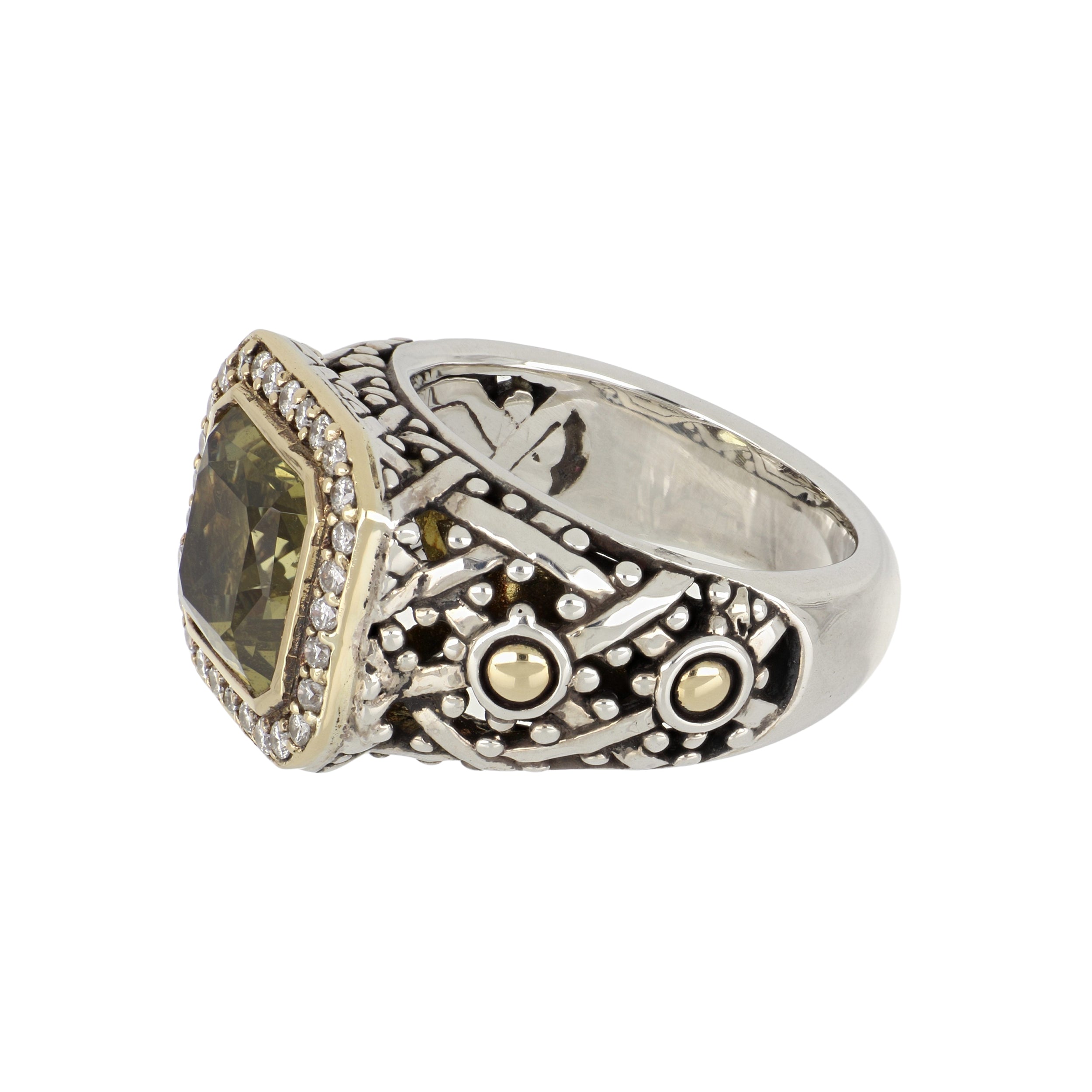 An estate John hardy "Batu Sari" ring featuring a square-cut citrine surrounded by a halo of round brilliant-cut diamonds, set in sterling silver and 18K yellow gold. Circa 2000.