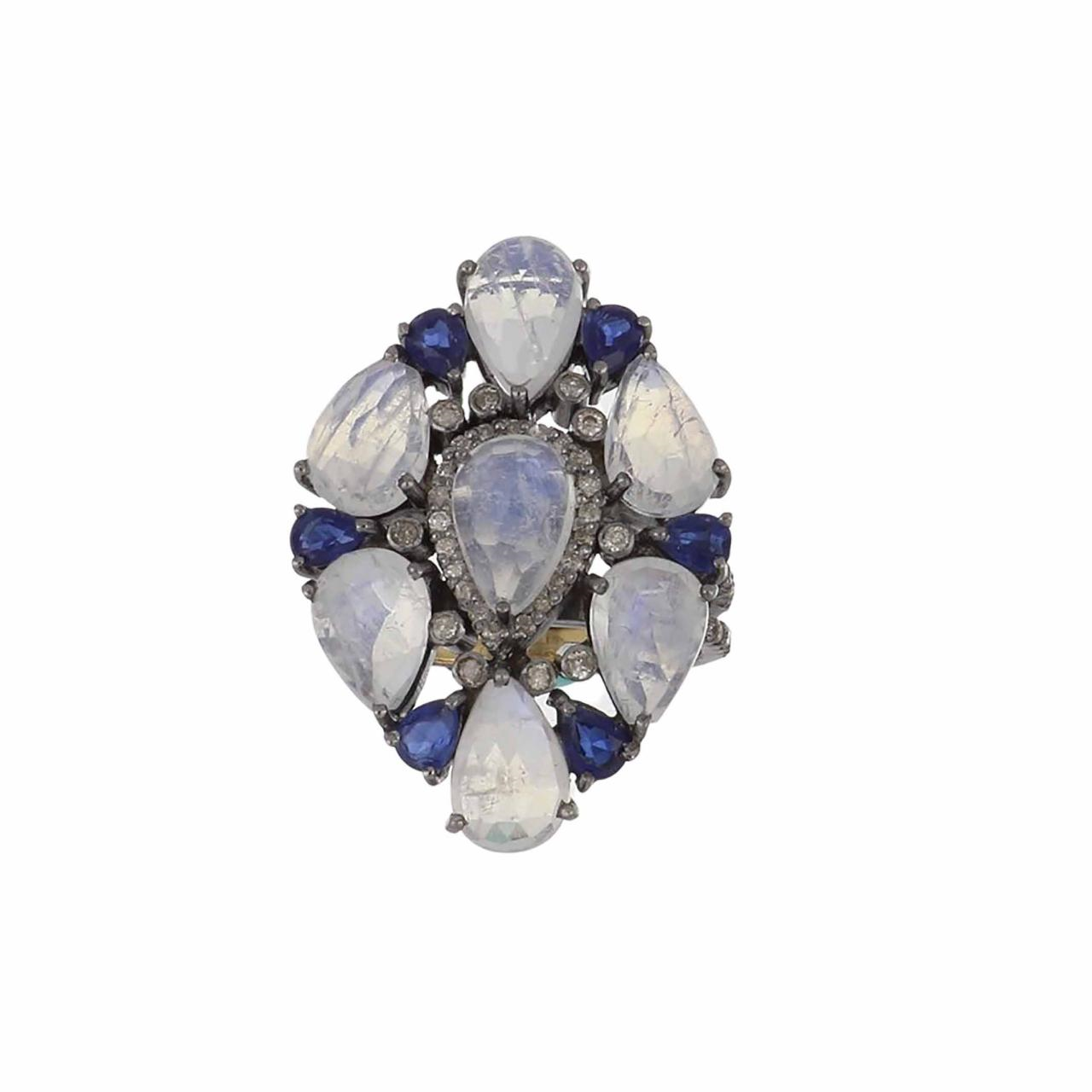 Maharaja Sterling Silver Moonstone Cluster Ring with Sapphires