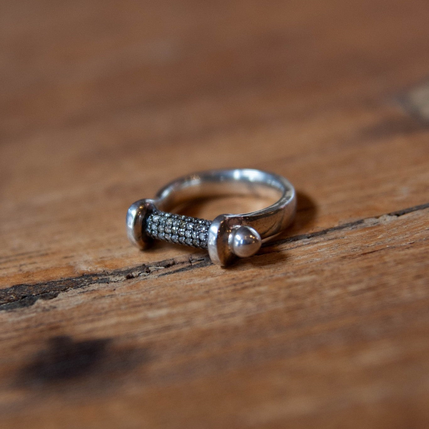 A Vincent Peach sterling silver shackle ring with round diamonds.
