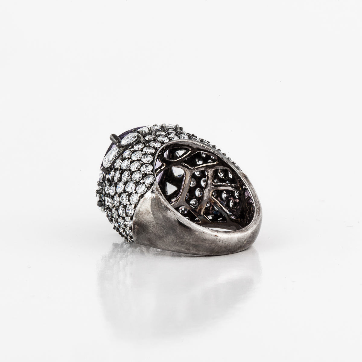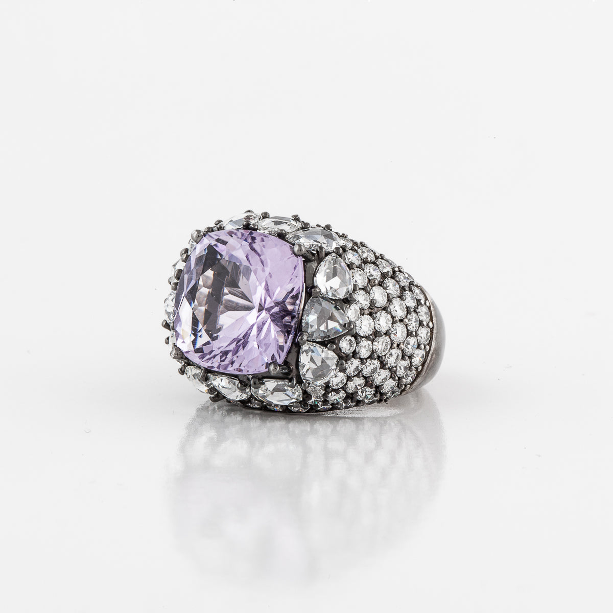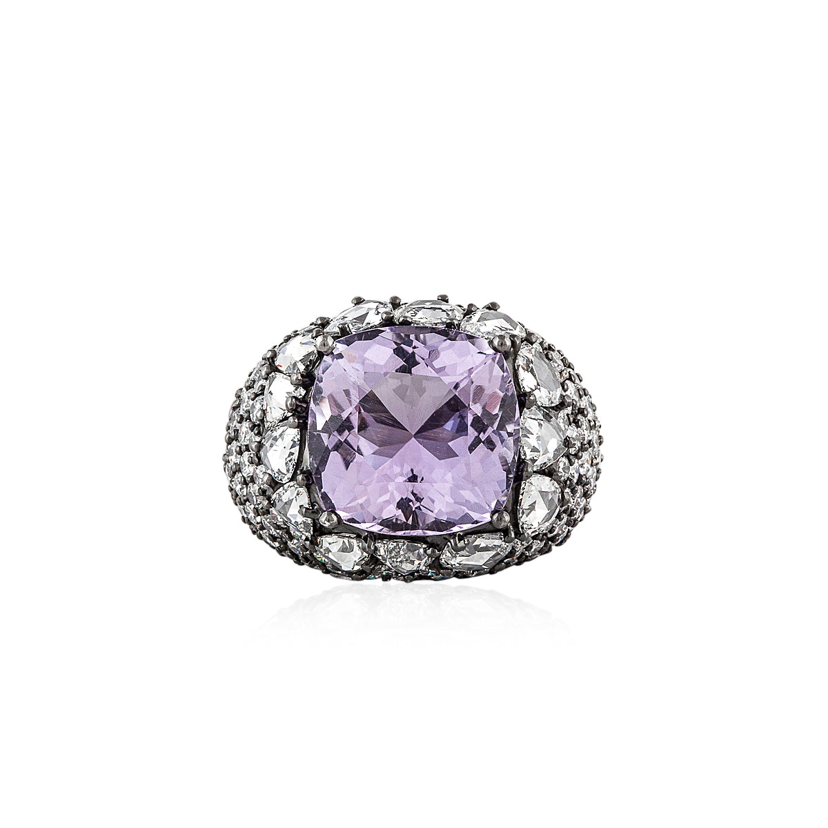 A vintage cushion-cut amethyst ring with round and rose-cut diamonds, set in blackened 18K gold.