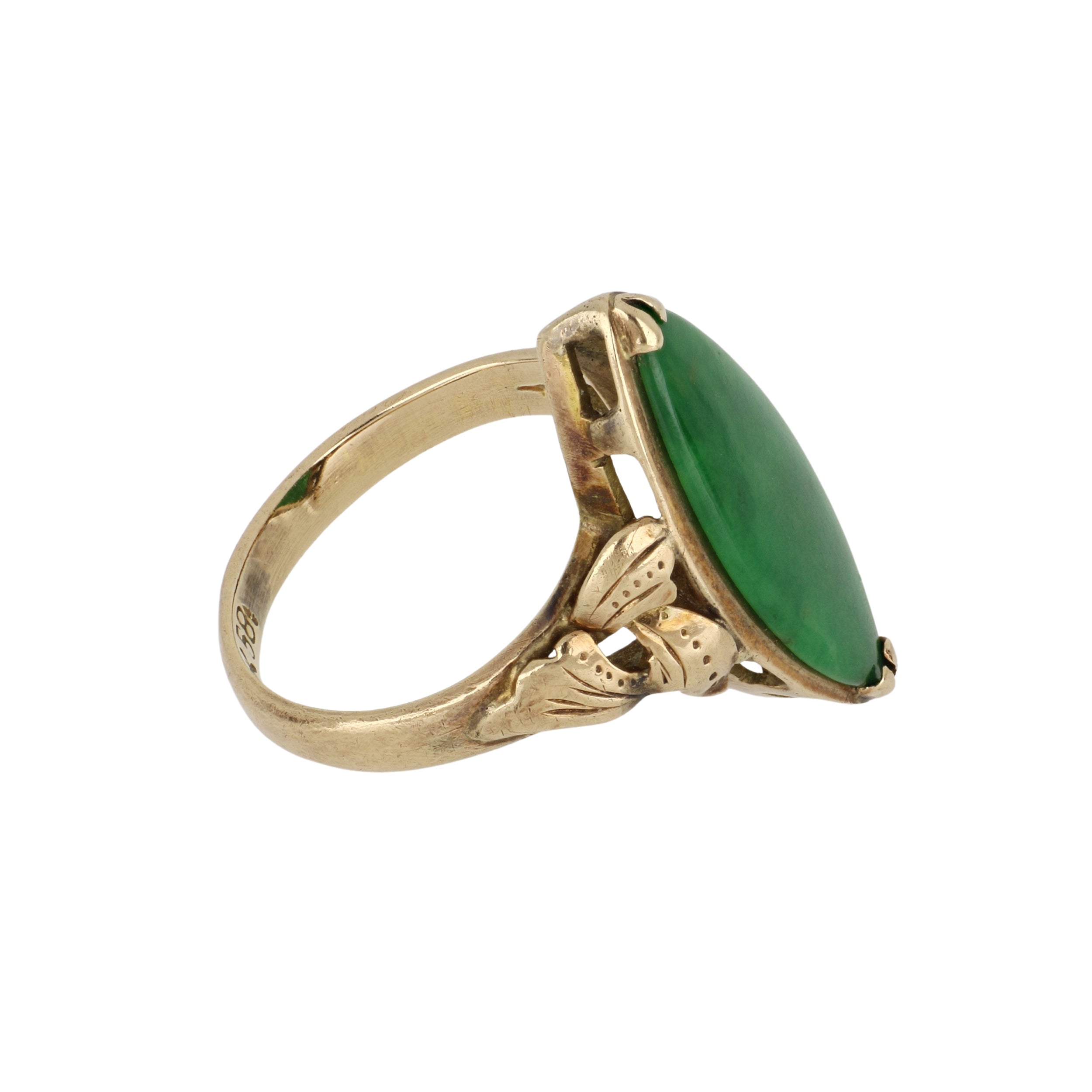 An Art Deco marquise shape jade ring, set in 14K yellow gold. Circa 1930s.