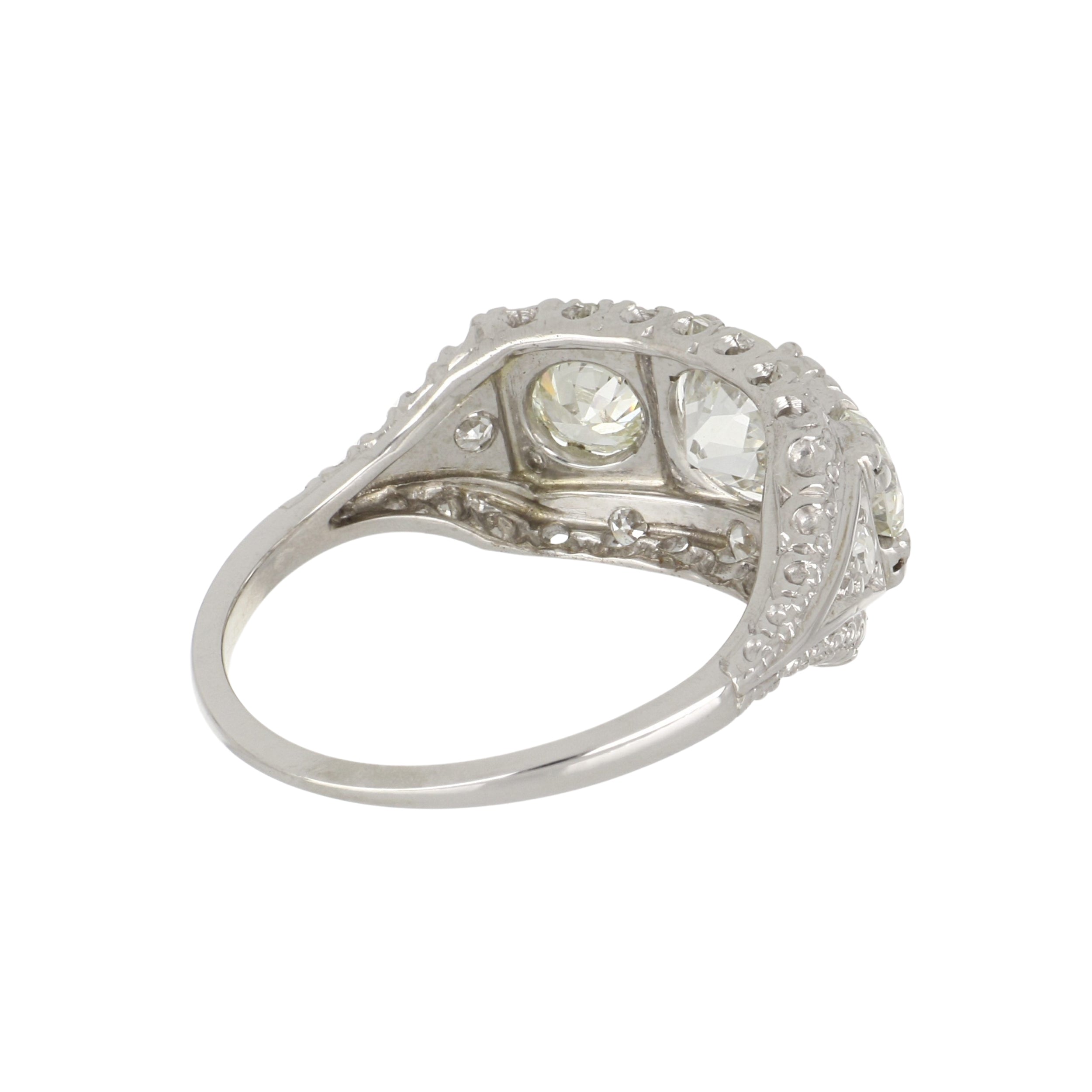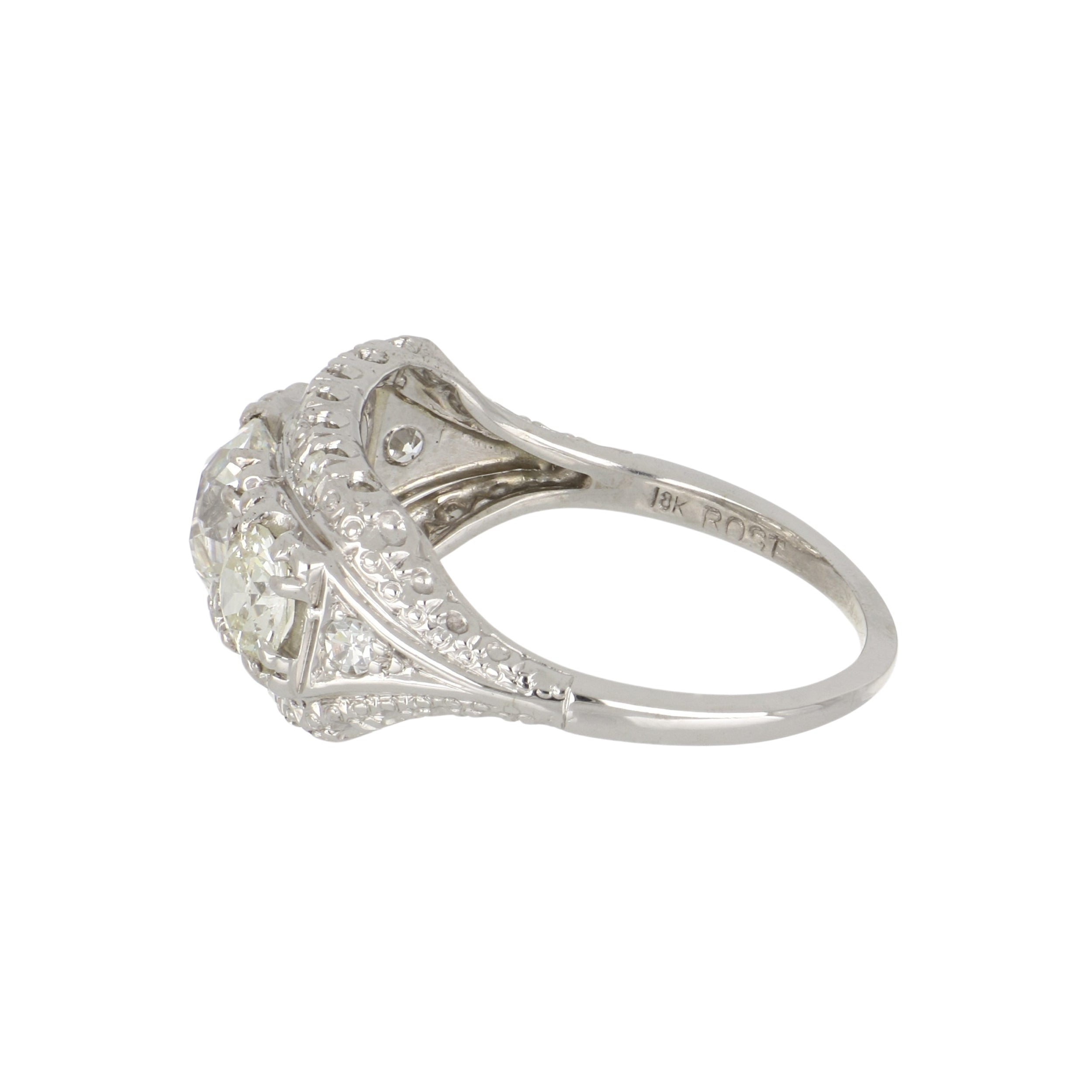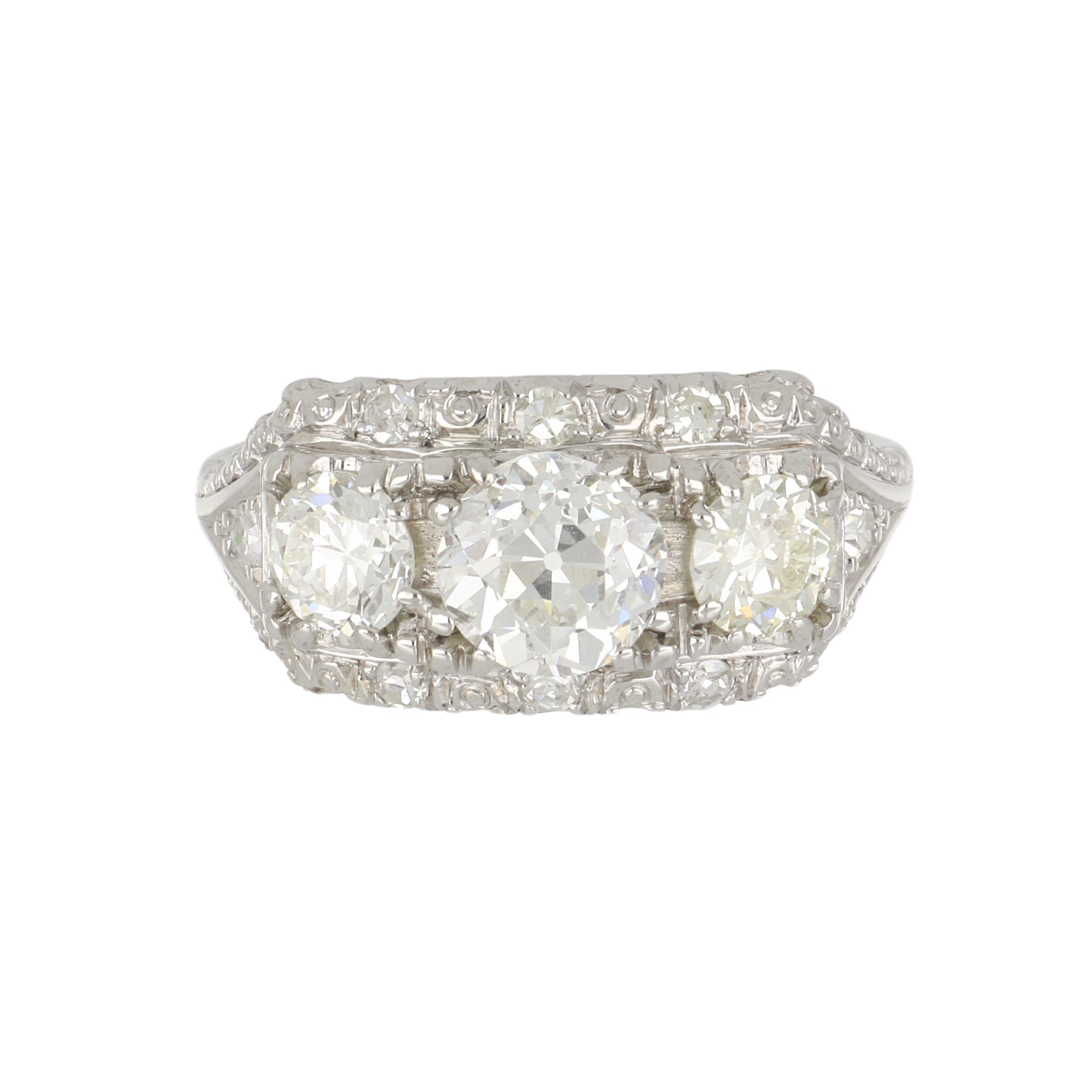 An Art-Deco three-stone Old European-cut diamond ring accented by a frame of single-cut round diamonds set in 18K white gold. Circa 1930.