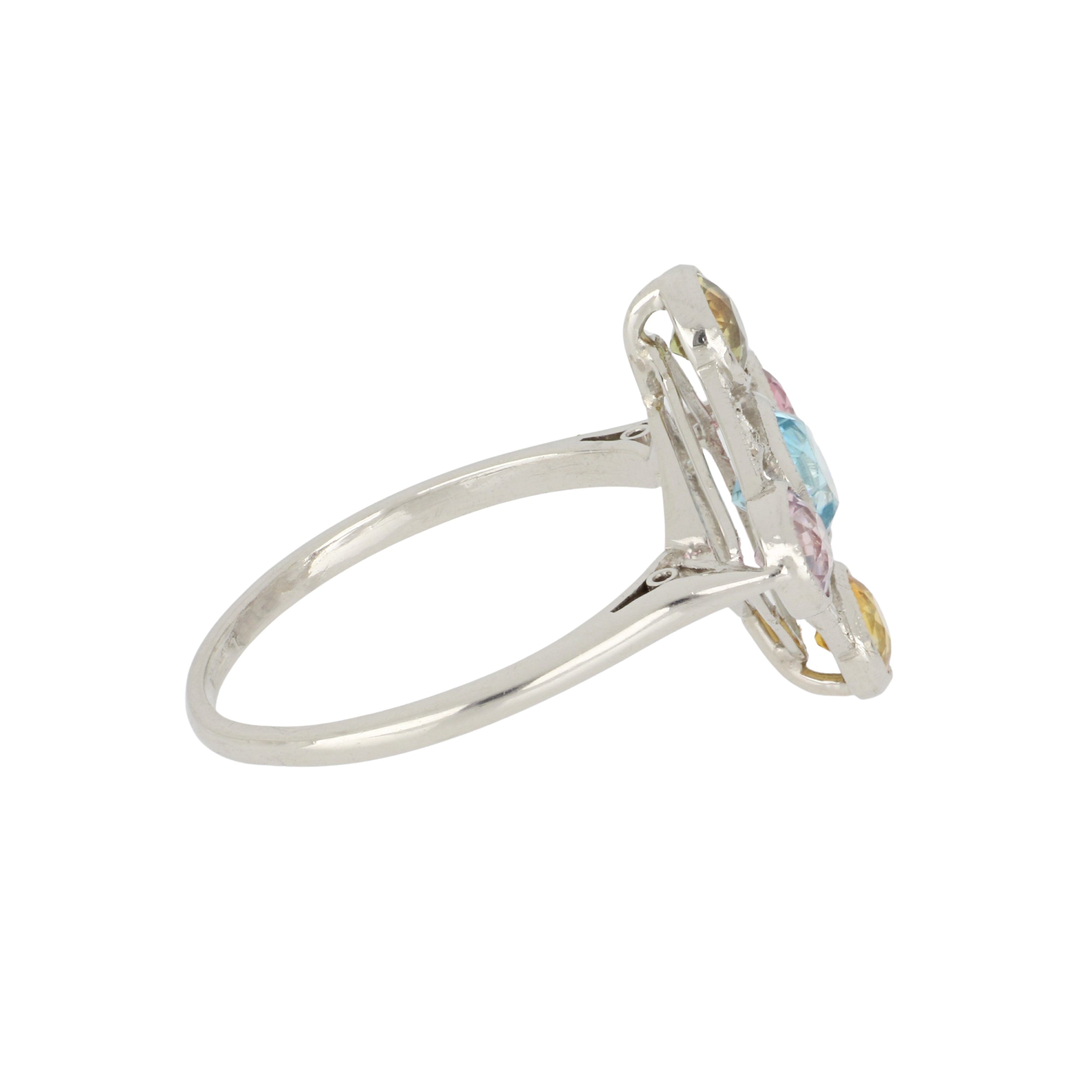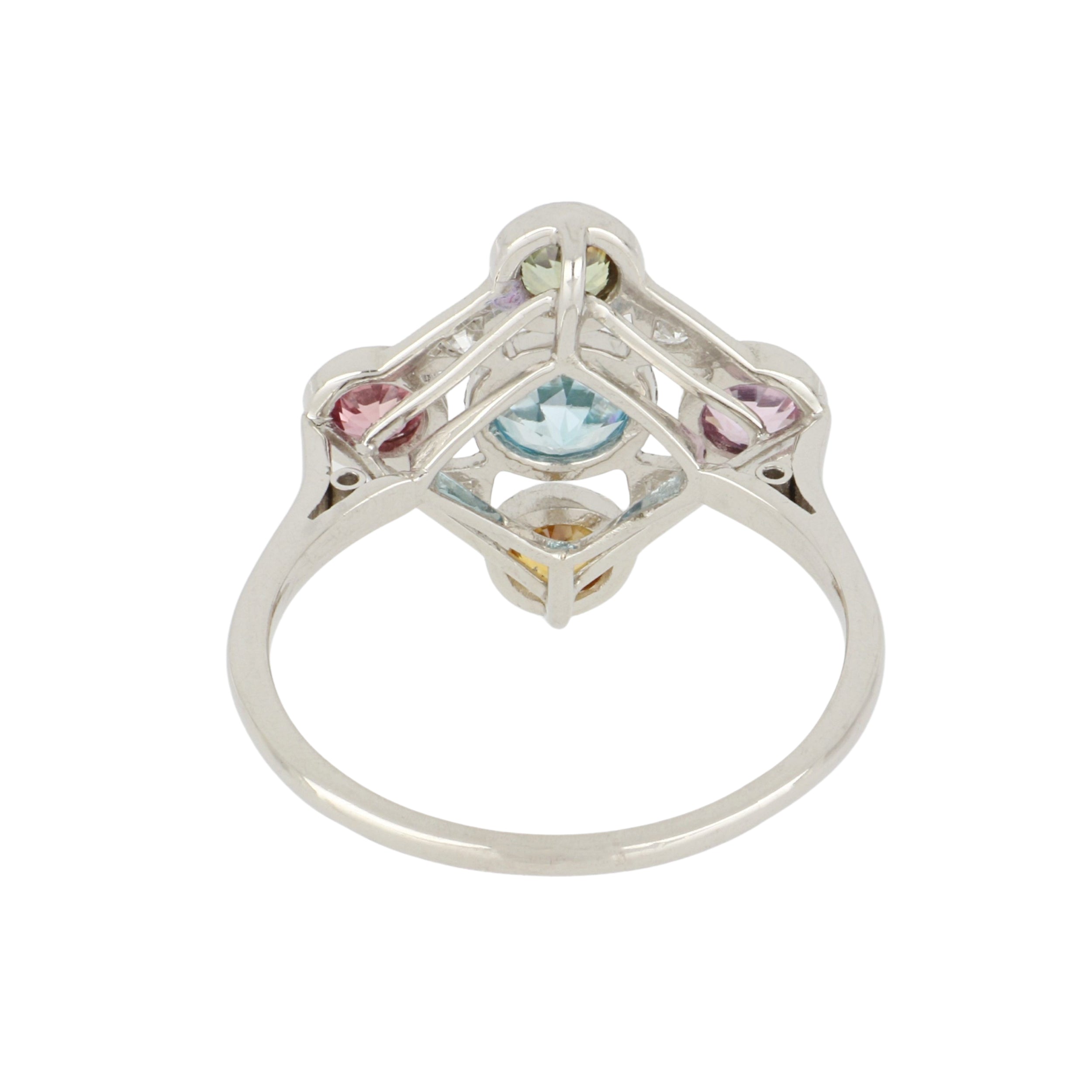 An Art-Deco round brilliant-cut multicolor zircon plaque ring set with single-cut round diamond accents, set in platinum with chenier. Circa 1930.