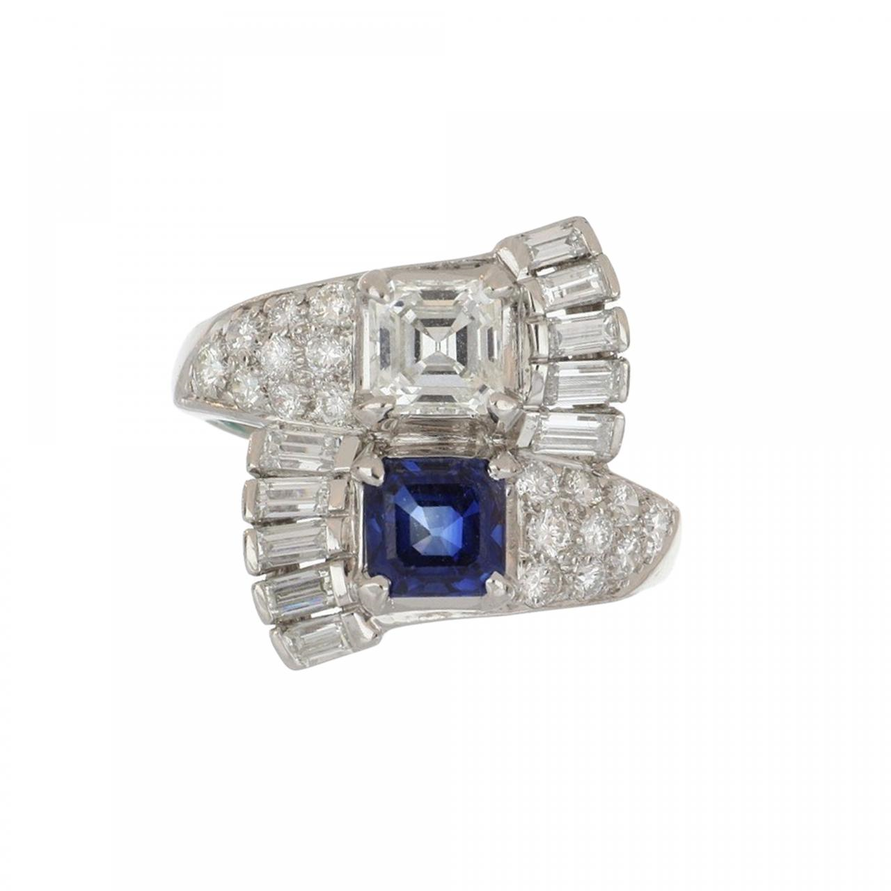 An Art-Deco bypass ring set with square step-cut, baguette-cut, and Old European-cut diamonds and a single square step-cut sapphire in platinum. Peacock Hallmark, circa 1930.