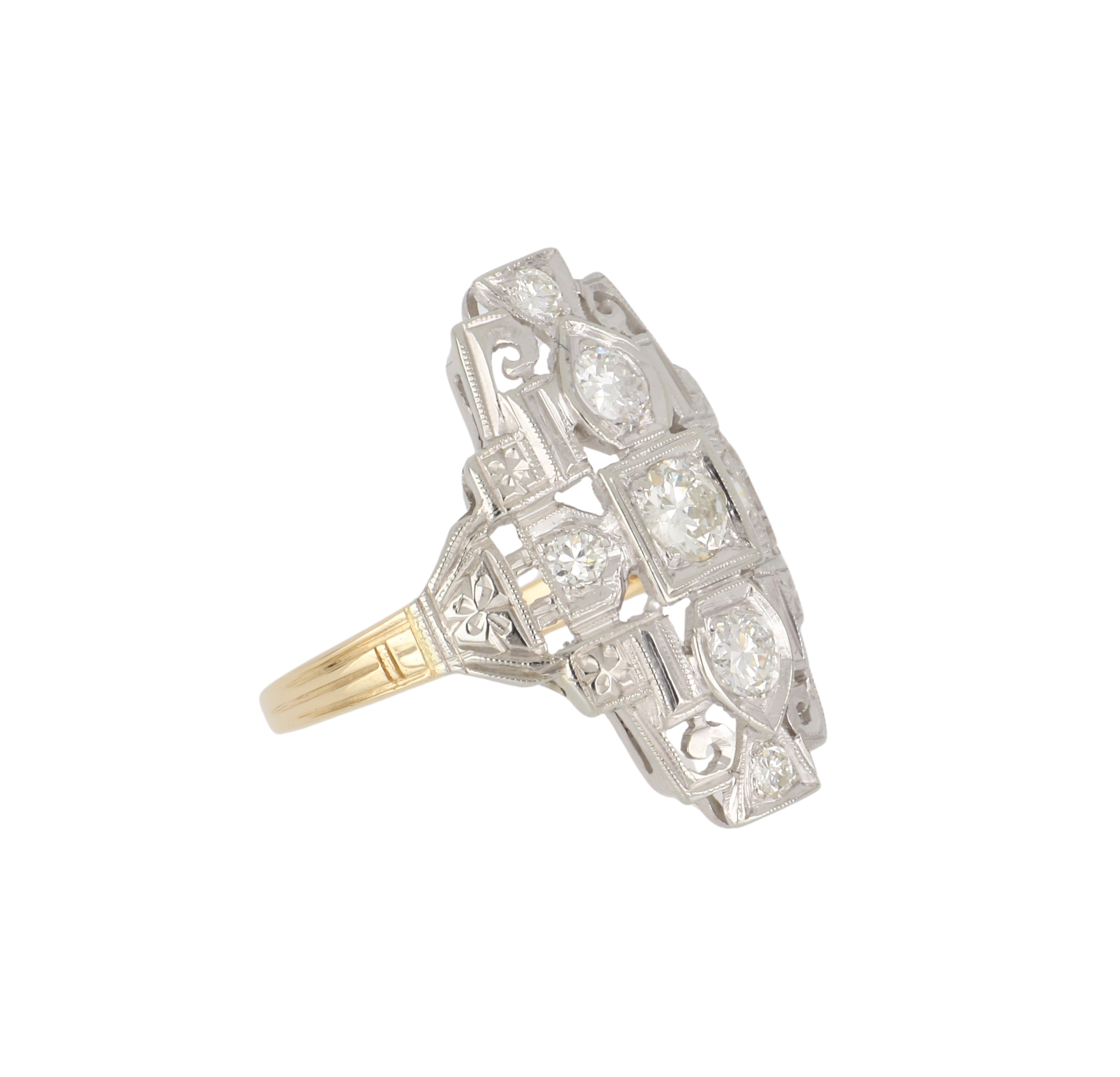 An Art Deco, filigree, orange blossom navette ring featuring Old European-cut diamonds, set in 14K yellow and white gold. Circa 1930.