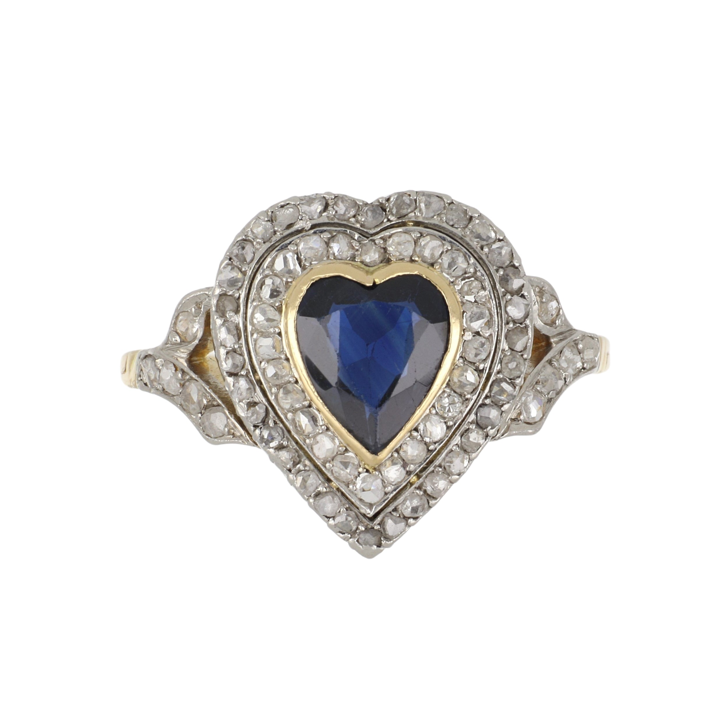 An antique Belle Epoque heart shape sapphire target ring with open-work gallery and gored shank with diamonds, set in 18K yellow gold and sterling silver. Circa 1890.