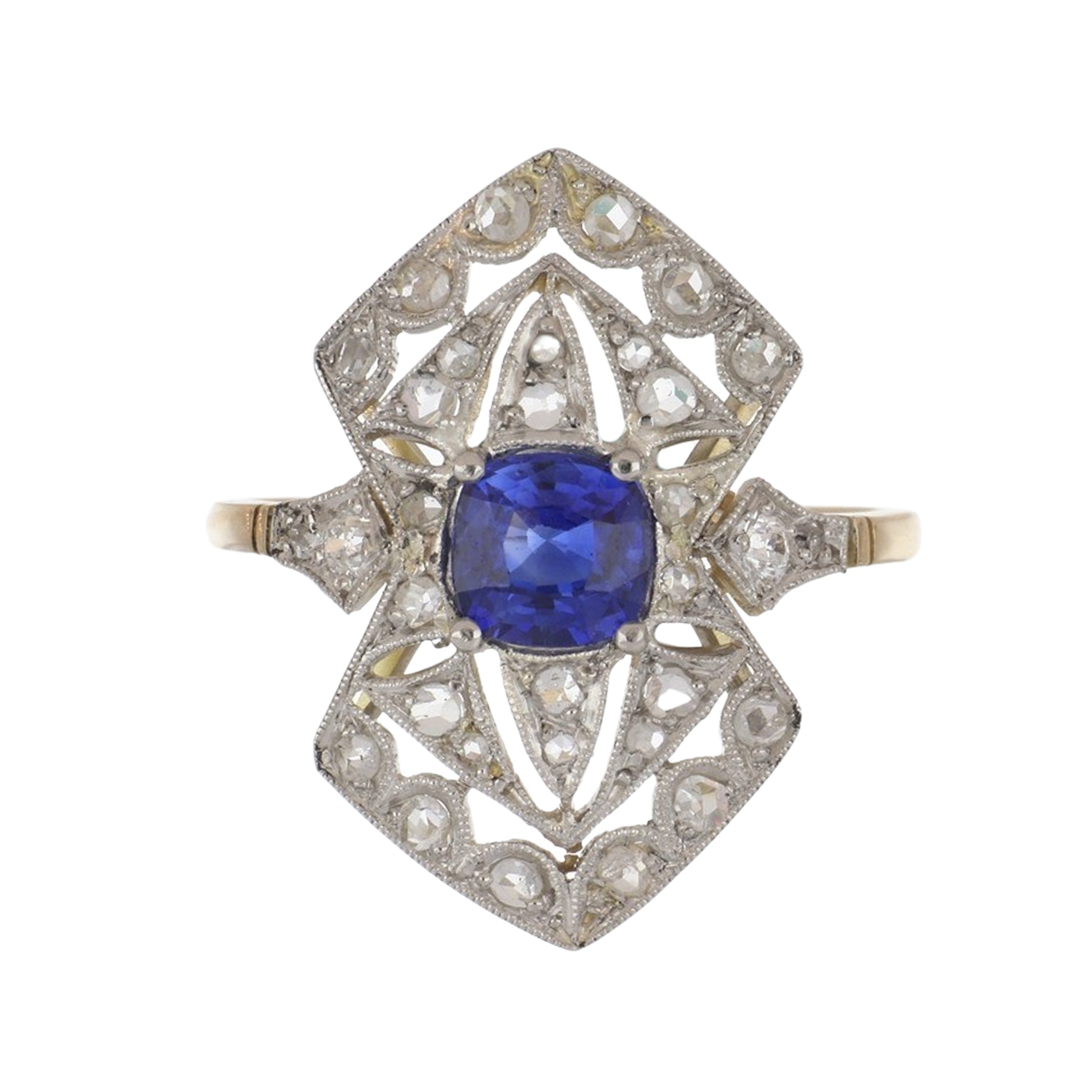 An Edwardian cushion-cut sapphire openwork navette ring with Old European-cut diamond accents, set in platinum and 18K yellow gold.