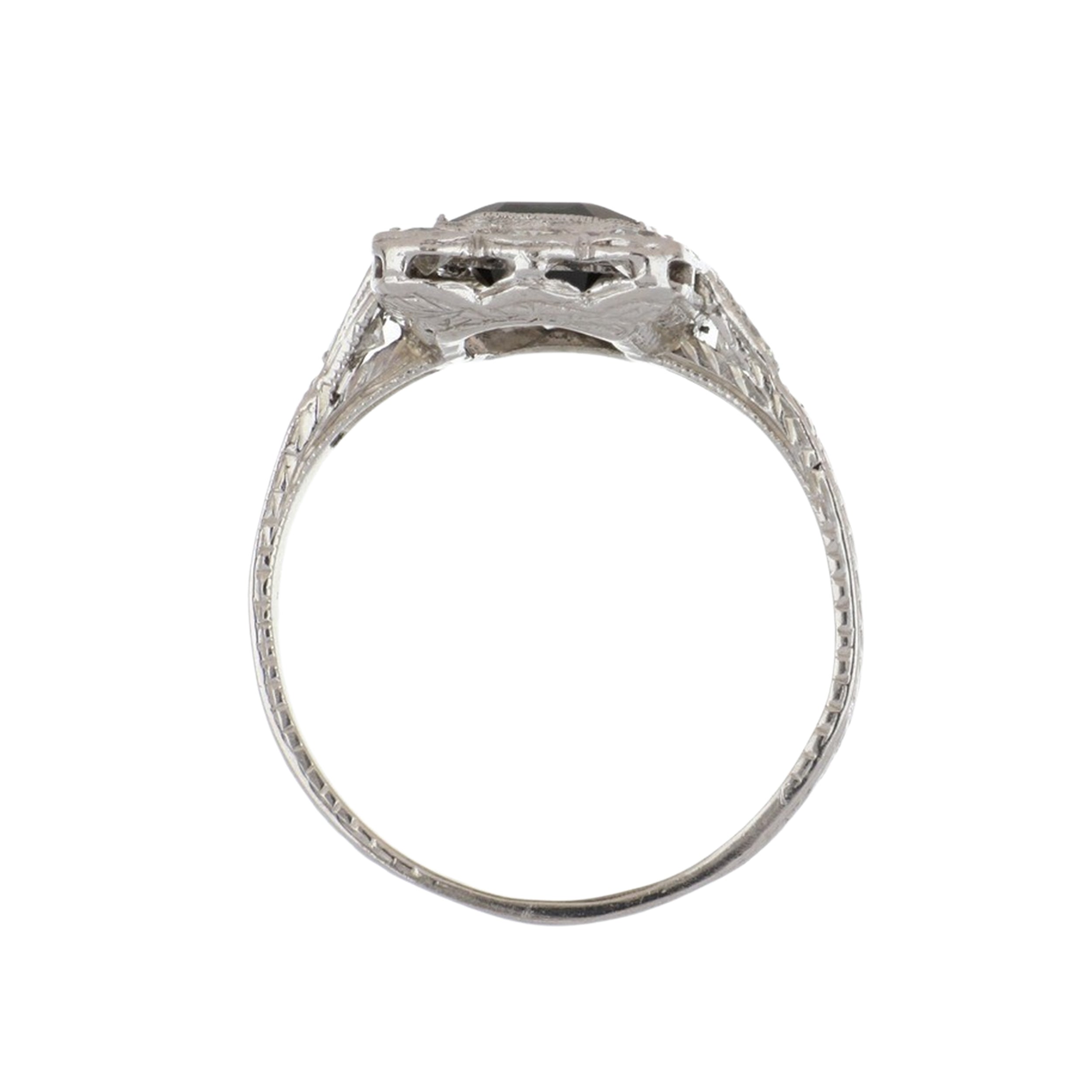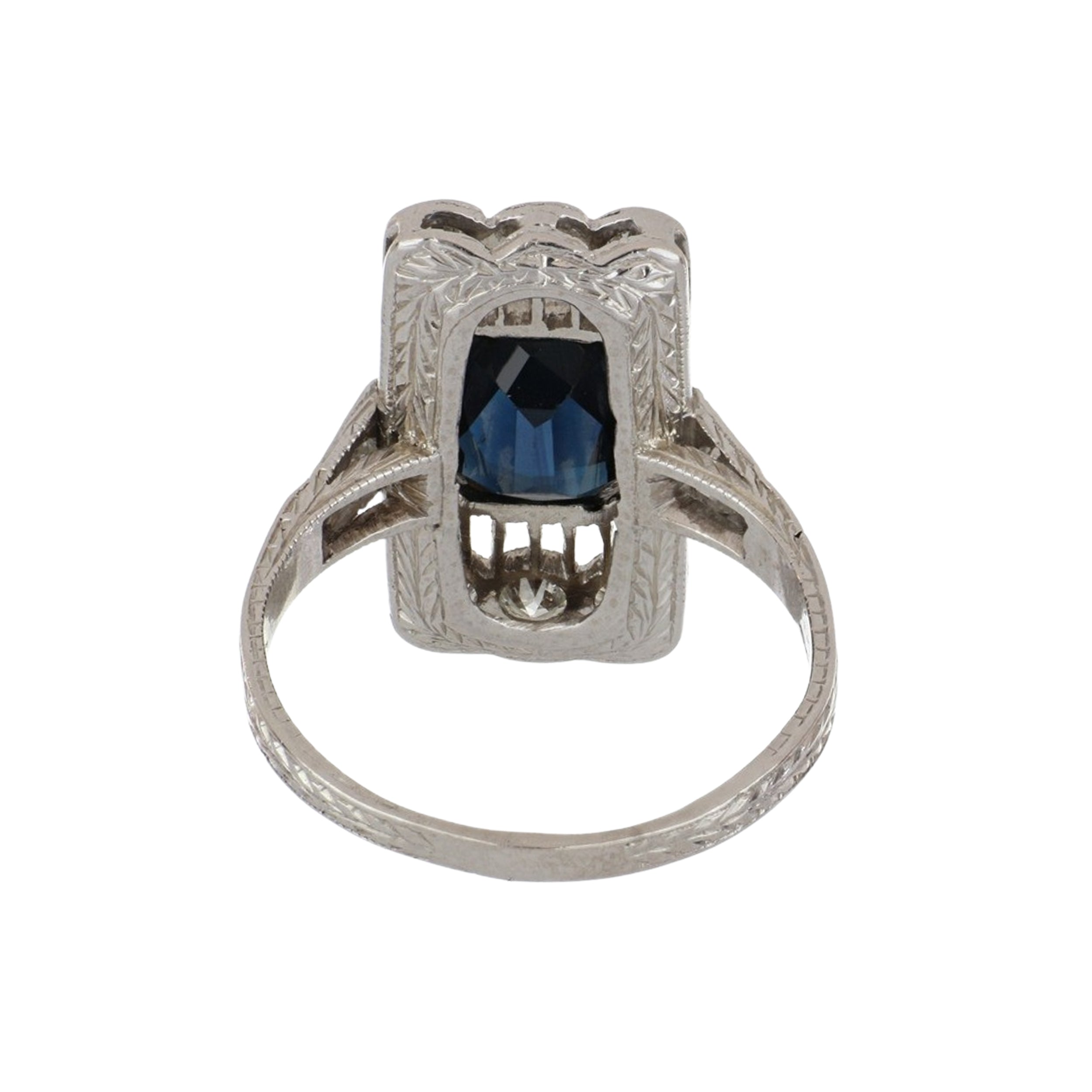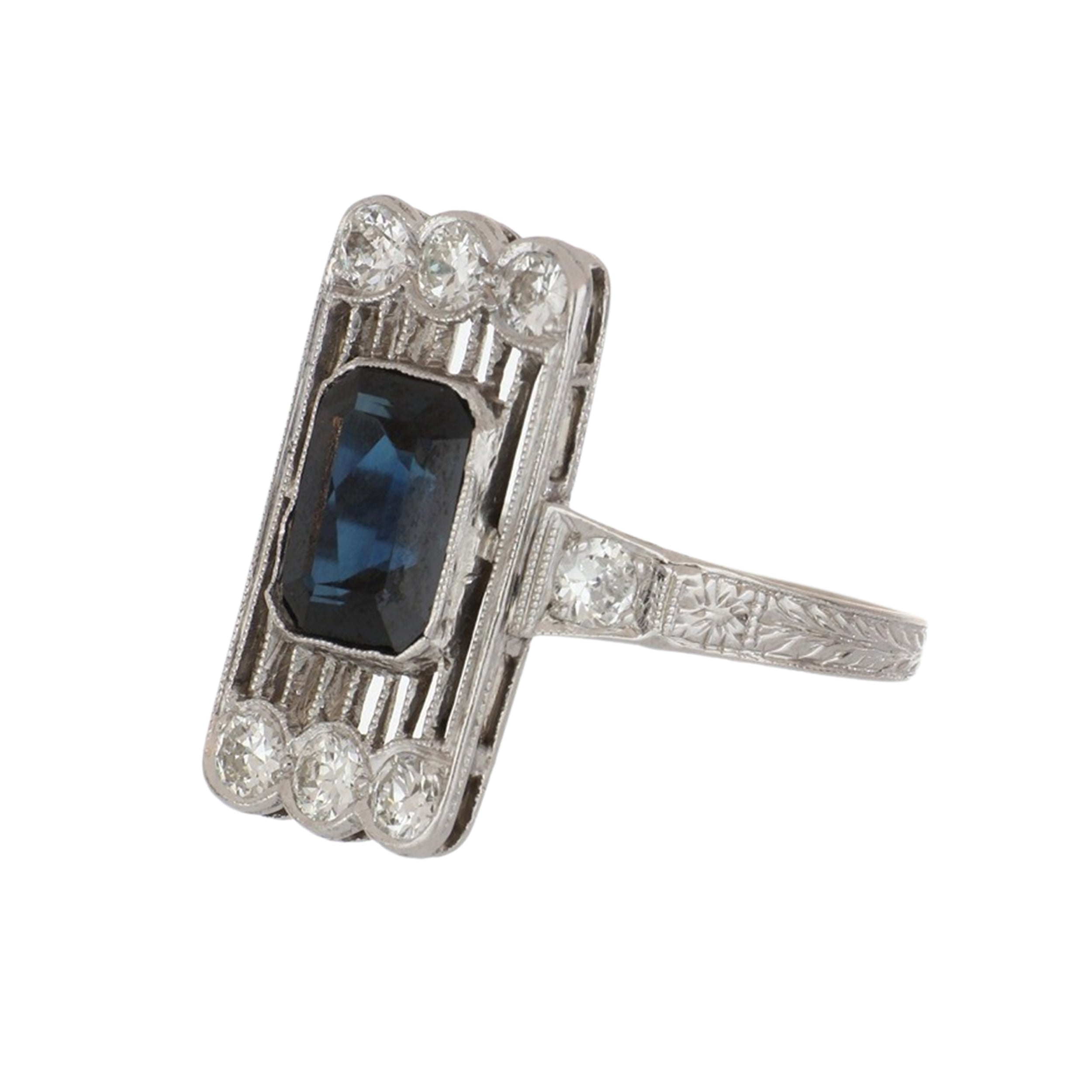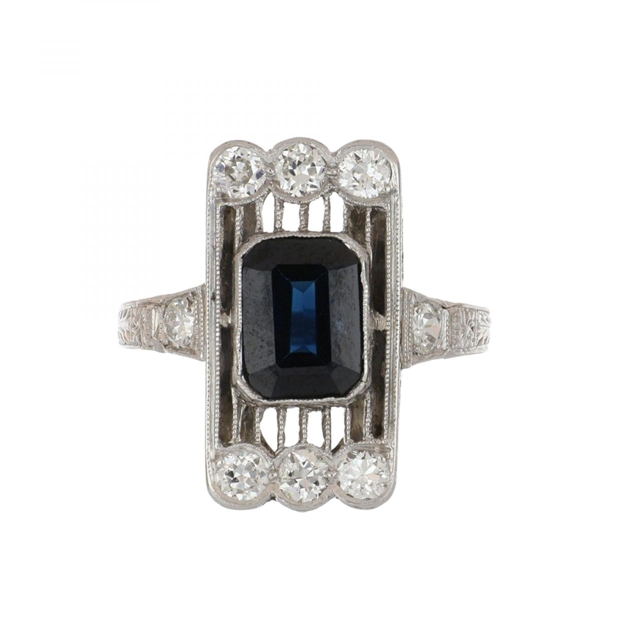An Edwardian platinum filigree sapphire and diamond plaque ring with diamonds. Circa 1910.