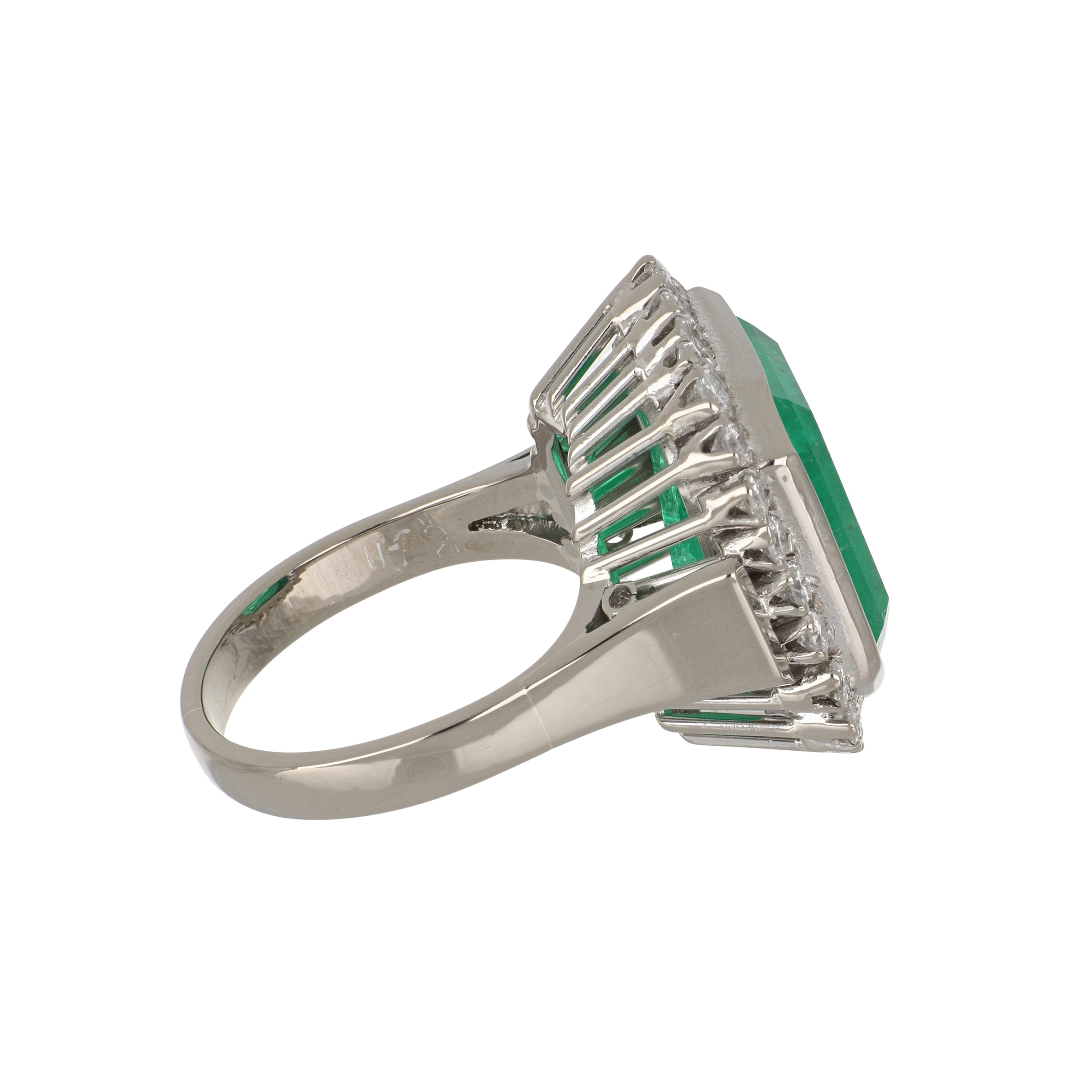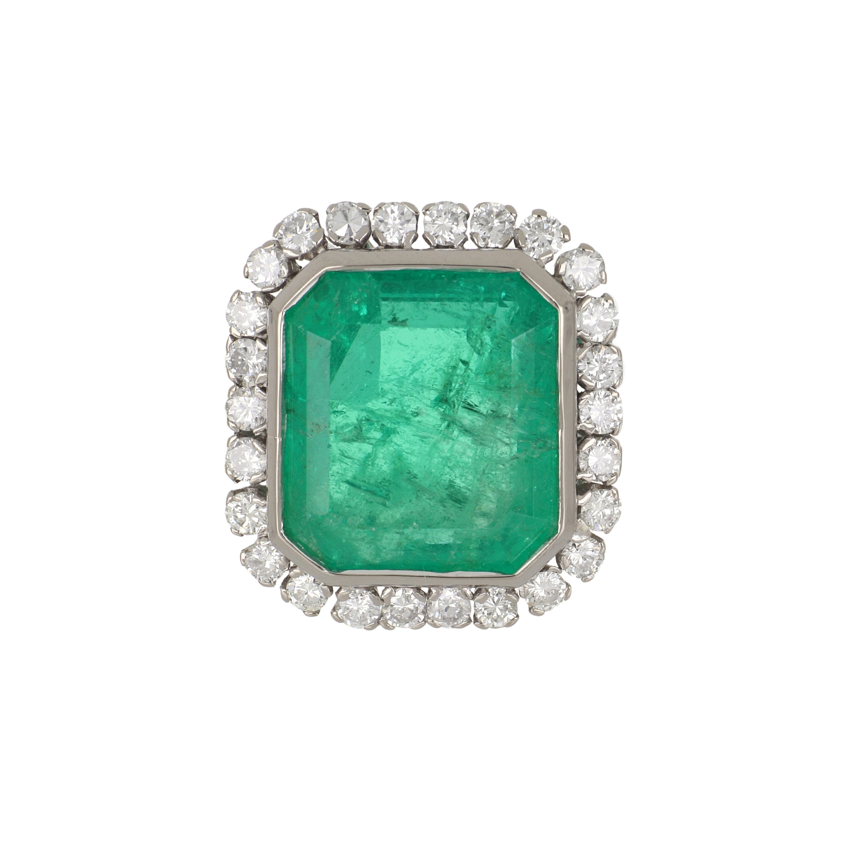 A Mid-Century emerald-cut natural Colombian emerald and diamond cocktail ring, set in platinum. Circa 1960.