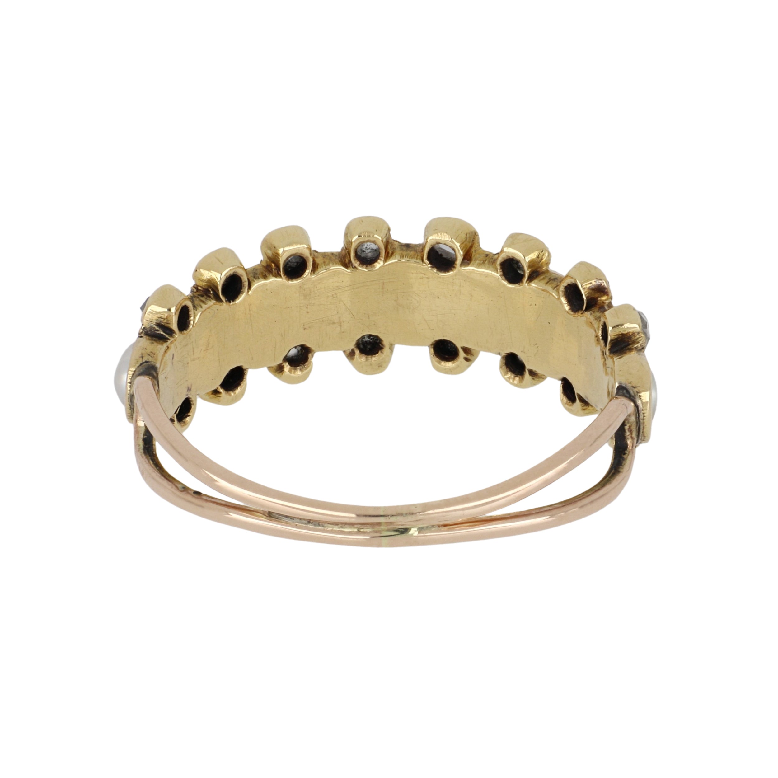 A Victorian half hoop split pearl and rose-cut diamond ring, set in 10K yellow gold. Circa 1890.